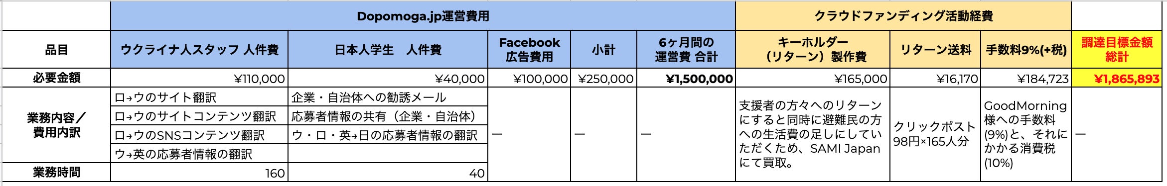 2024/05/21 10:00皆様、ご無沙汰しております!2022年9月-2023年12月の15ヶ月間の活動報告をさせていただきます。Dopomoga.jpの皆様からいただいた支援金を活用した活動実績を報告させていただきます。以前ご報告させていただきましたとおり、目標の150%で達成できました。ありがとうございました。当初の計画としては、半年間の人件費を支援いただくことを目標に進めていましたが、2023年にかけてウクライナ周辺国の情勢の変化に伴ってFacebookのアド配信にかける金額を減らしていったため、結果的に15カ月間の人件費を支払うことができました。皆様、本当にありがとうございました。重ねて感謝申し上げます。【収支報告】2023年12月時点・クラウドファンディングで頂いた金額:2,554,335円・キーホルダー代:-165,000円(2022年11月)・広告費:-216,644円(2022年9月-2023年9月の1年間)・人件費:-150,000円×15ヶ月(2022年9月-2023年12月)=-77,309円(赤字)【その他の活動実績】2023年1月-12月また、上記の収支に関わる活動以外で、Dopomoga.jp(SAMI)として厚生労働省の避難民向けウクライナ語YouTubeショート動画の制作(+ウクライナ語への翻訳)を担当させていただきました。また、ウクライナ人スタッフ(カーチャ)の日本移住についてもSAMIから拠出する形でサポートしました。⚫︎2023年3月・12月厚生労働省の避難民向けウクライナ語YouTubeショート動画(合計6本)の制作をサポートしました。⚫︎2023年3月-2023年11月Dopomoga.jpのウクライナ人スタッフが日本に移住するにあたり、人件費以外の生活に関わる費用(賃貸契約費、渡航費、生活用品購入)をサポートしました。2024年もDopomoga.jpの活動を続けてまいりますので、引き続き、どうぞよろしくお願いいたします。SAMI / Dopomoga.jp 平井 もっと見る