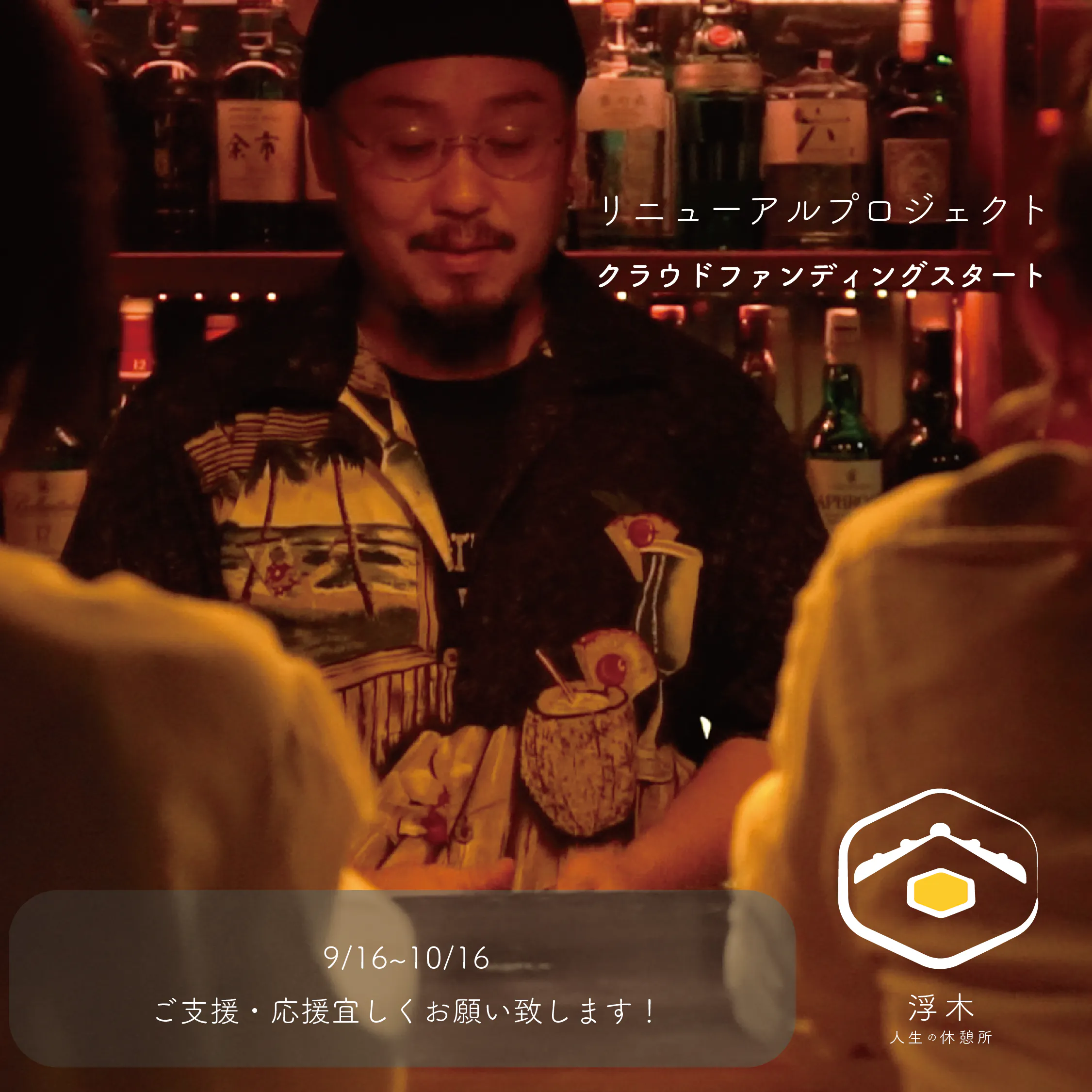 焚き火やセルフの日本酒棚、バースペースといった日常とは違った空間で、日常とは違う誰かに会える場所という飲んで泊まる事もできる「浮木」を存続させたい!という思いで、リニューアルプロジェクトが始動しました。