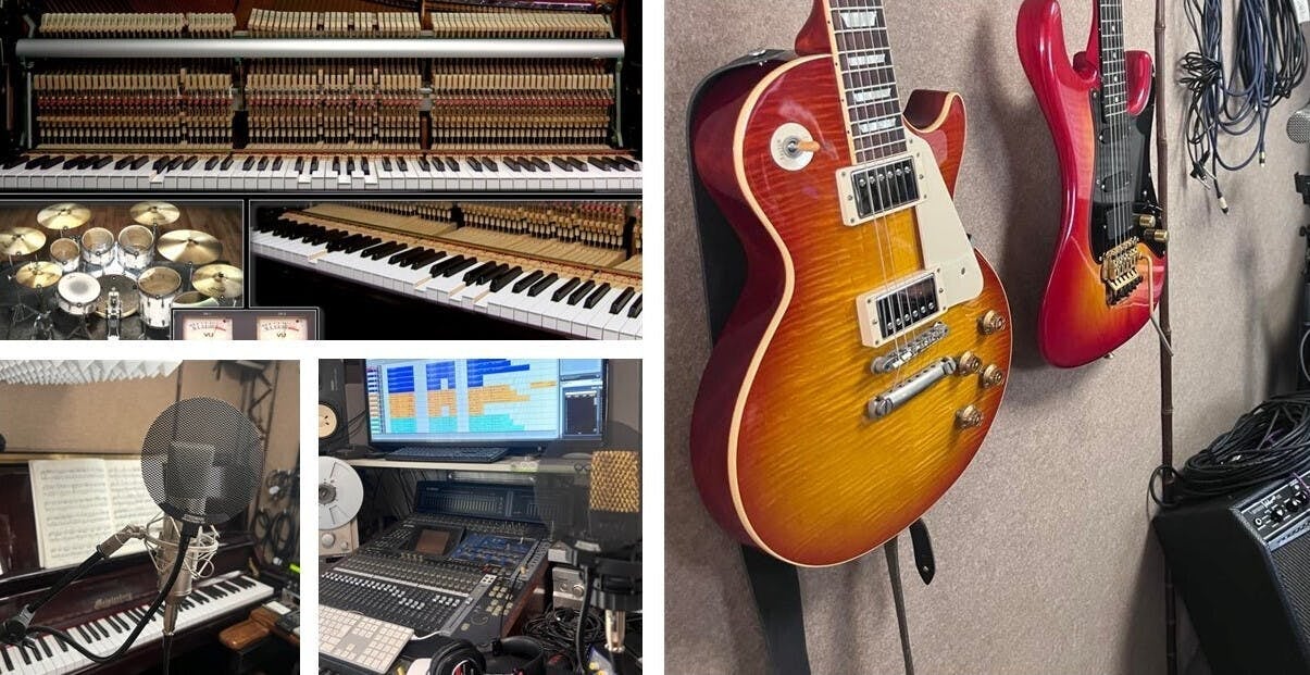スタジオにはピアノ、シンセサイザー、キーボード、ギター…。なんでも揃い、アナログとデジタルで音を制作。