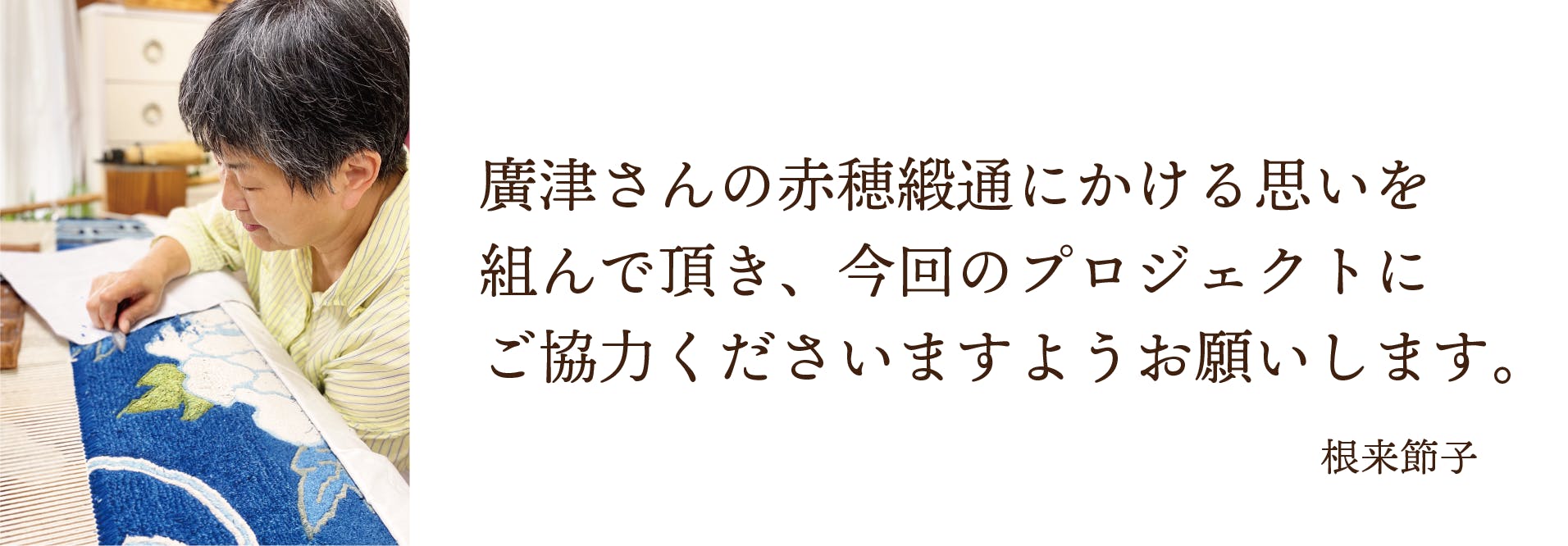 2022年4月から弥生工房の根来さんの元で修業を始めました。2年後には自分の工房を開けるように頑張っています。今はしっかりと受け継がれてきた伝統と技術を身に付けて、伝統的な文様に自分のデザインを混ぜ合わせたオリジナル柄の作品も制作していきたいと思っています。赤穂緞通に魅了され、根来さんに受け入れて頂き緞通を織れることに感謝し、自分は赤穂緞通のこれからになにができるか考えながら緞通と向き合っていきたいと思っています。
