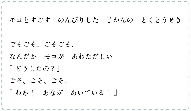 主人公あこと飼い犬のモコは昼下がりに緞通で寝転がりながらゆっくり過ごすことが至上の時間。ある日、モコが何かを発見!