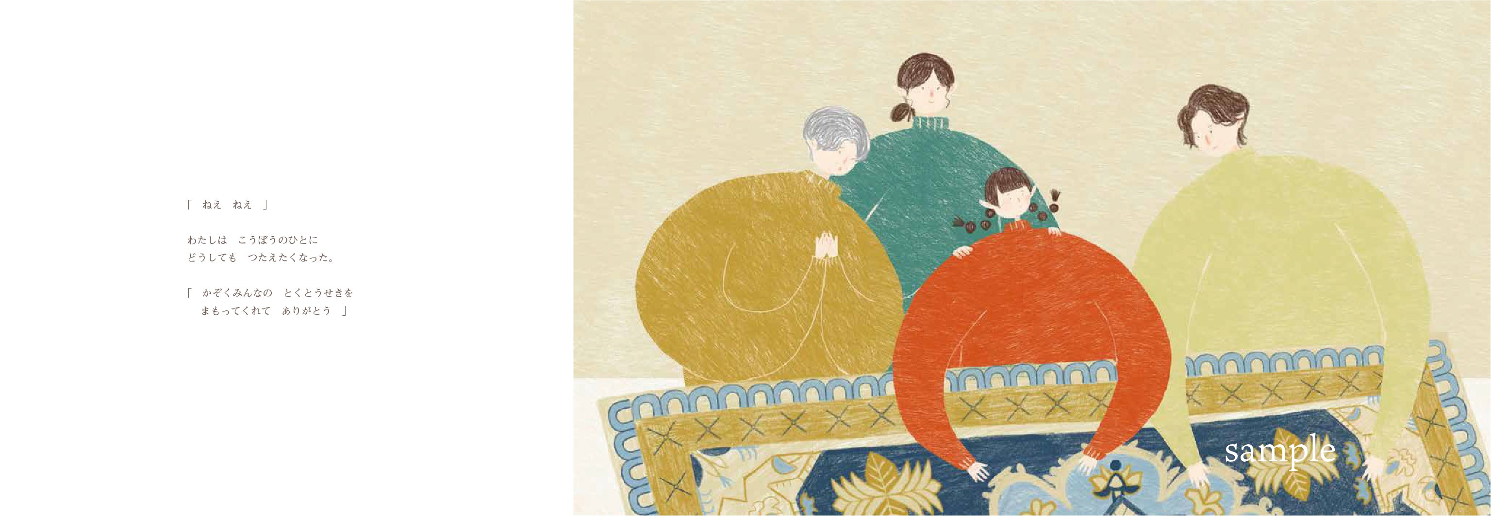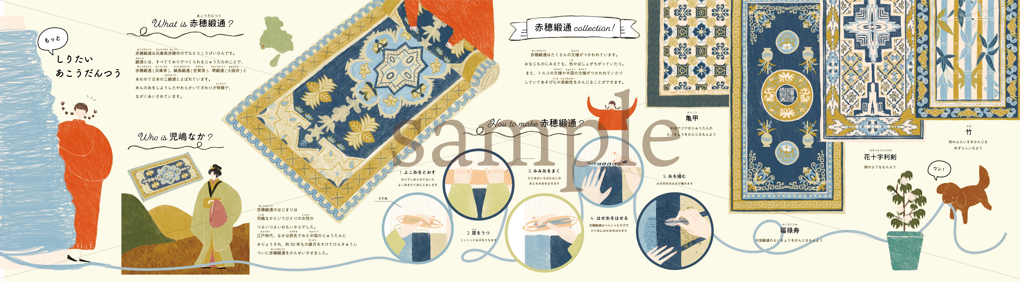 100年以上の歴史がありながらも戦後の機械化による大量生産の時代に入ると、繊細な手作業が主な赤穂緞通は一度は後継者不足で存続の危機にありました。しかし赤穂緞通への強い思いを持った織り手の方々によって今も伝統が継承されています。私は赤穂緞通に魅せられ、赤穂緞通の素晴らしさを実感しました。日本にはそんな素晴らしい伝統と技術がある赤穂緞通があるということを知ってもらいたいと思い、赤穂緞通をテーマにした絵本を制作しました。
