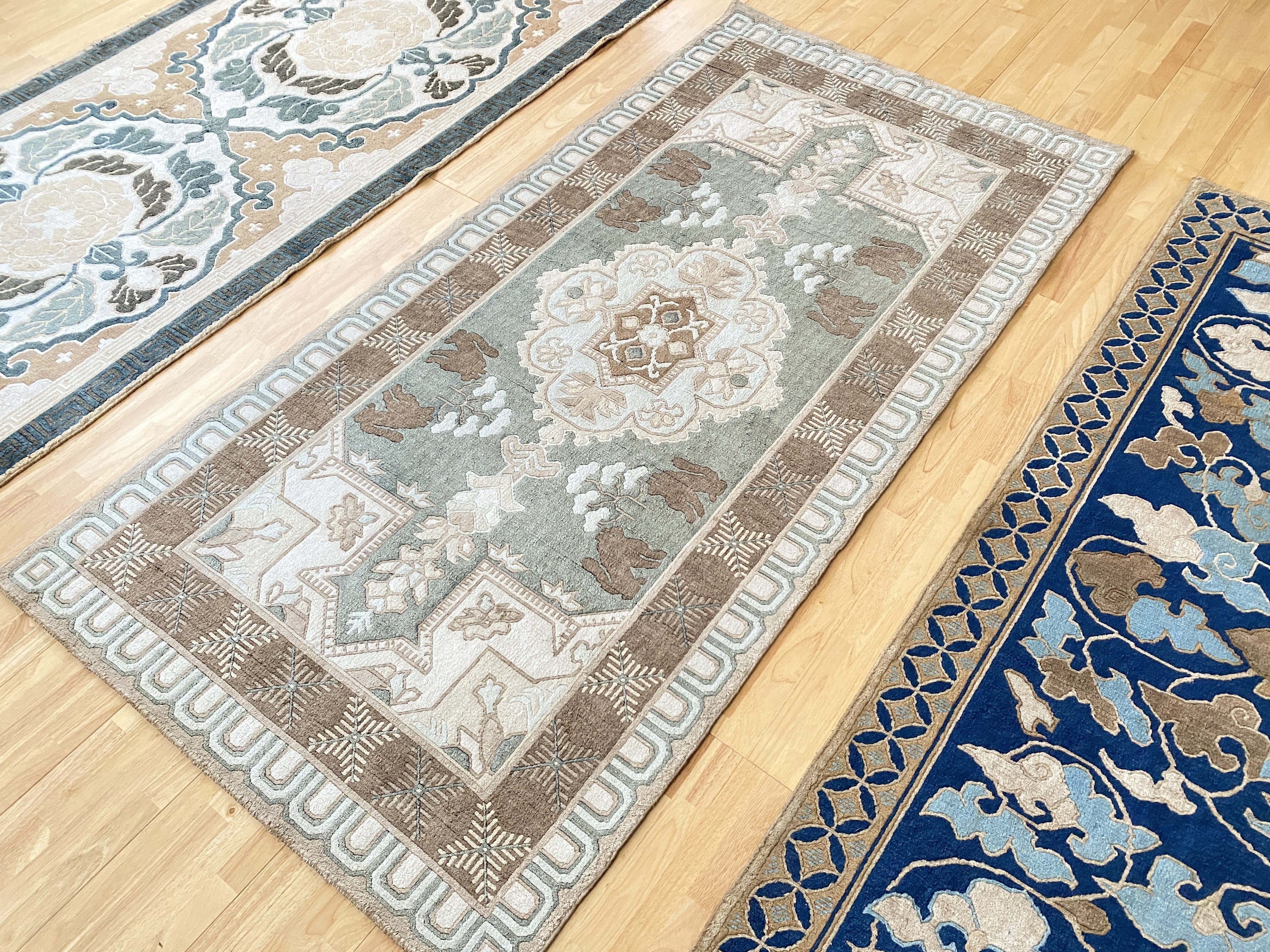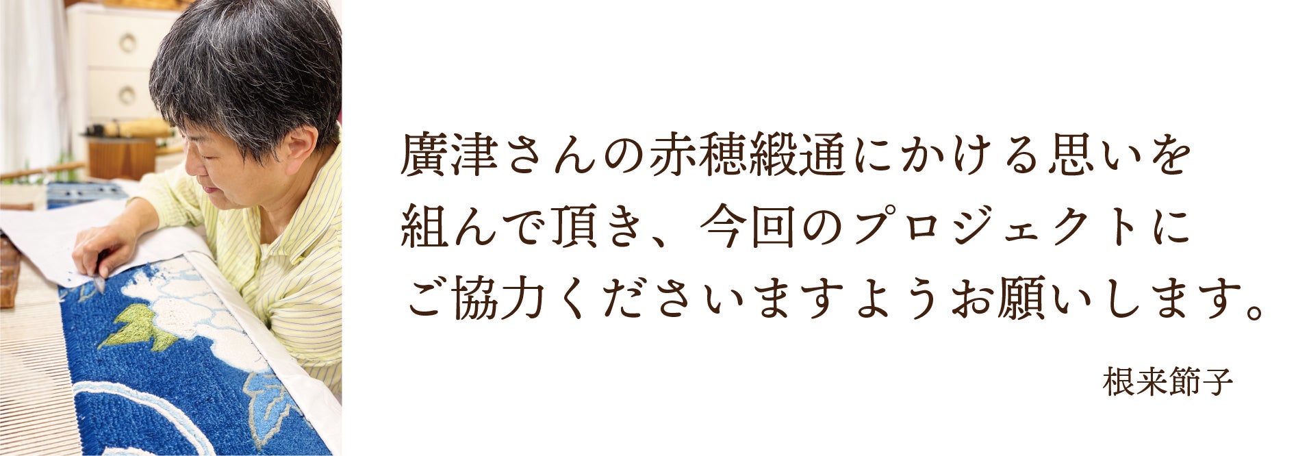 2022年4月から弥生工房の根来さんの元で修業を始めました。2年後には自分の工房を開けるように頑張っています。今はしっかりと受け継がれてきた伝統と技術を身に付けて、伝統的な文様に自分のデザインを混ぜ合わせたオリジナル柄の作品も制作していきたいと思っています。赤穂緞通に魅了され、根来さんに受け入れて頂き緞通を織れることに感謝し、自分は赤穂緞通のこれからになにができるか考えながら緞通と向き合っていきたいと思っています。