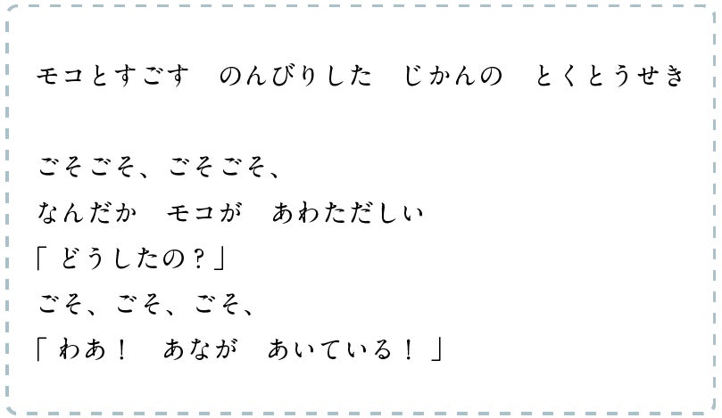 主人公あこと飼い犬のモコは昼下がりに緞通で寝転がりながらゆっくり過ごすことが至上の時間。ある日、モコが何かを発見!