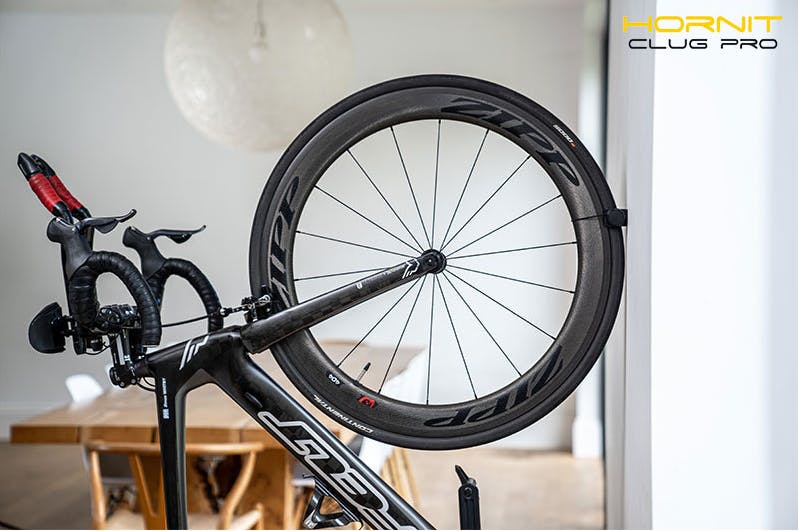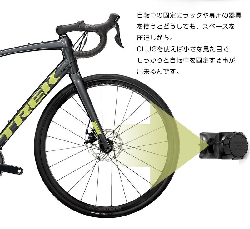 値段も決して安くはないスポーツバイク。ほとんどの場合、室内で保管するかと思いますが、自転車を室内で置くとなるとそれなりのスペースが必要。そこで知ったのがCLUG PROでした。この商品は自転車の縦置きをする際に持ち上げた前輪を、CLUG PRO本体に差し込んで、さらに調整紐で固定するもの。よく心配されるタイヤの空気圧低下で自転車が抜けて倒れる心配もありません。タイヤやリム、ボディへの負担も優しく、自転車を置いていない時は、スタンド型ではないので場所の圧迫もありません。