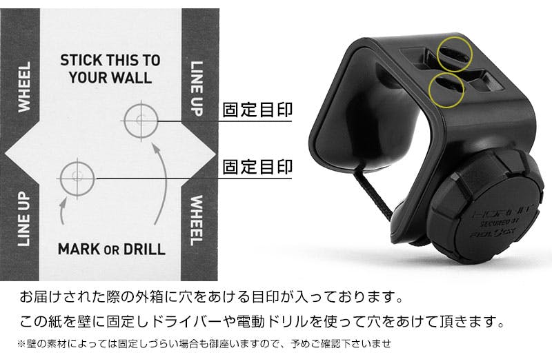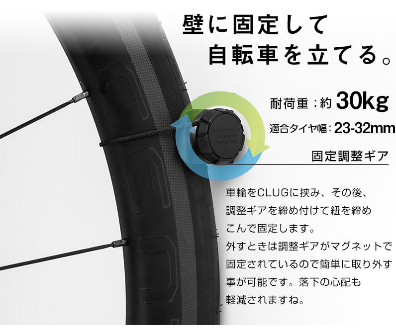 自転車の車輪を挟み込むだけでなく、調整ギアの紐でホイールを固定することによって、自転車をしっかりホールド。CLUG PROは、約30kgまで保持(※弊社にて重りを用いて実測済)できるように作られているため、長期間保管でのタイヤのパンクが発生した場合や、時間の経過で起こる空気の圧力低下でタイヤが平らになっても、自転車はしっかりと固定された状態で保管できます。