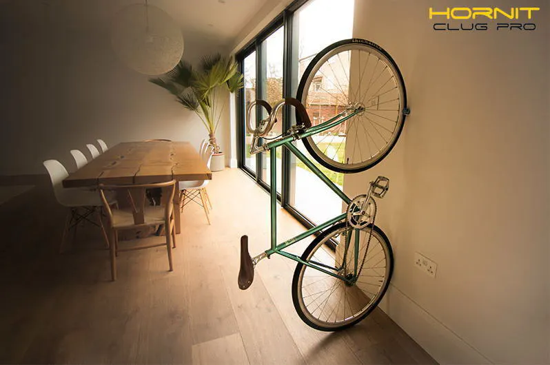 室内保管でのスペースの問題。それはほぼ解決できます。スタンドに引っ掛けて横置きするよりも、壁際に後輪を下にして前輪を上げ、立てておけばスペースは少なくすみます。結局は壁にスタンドを使うという点は同じですが、CLUG PROは自転車を立てていない時も、スタンドに見えず、見た目も小さい本体なのでとてもシンプルでスタイリッシュです。