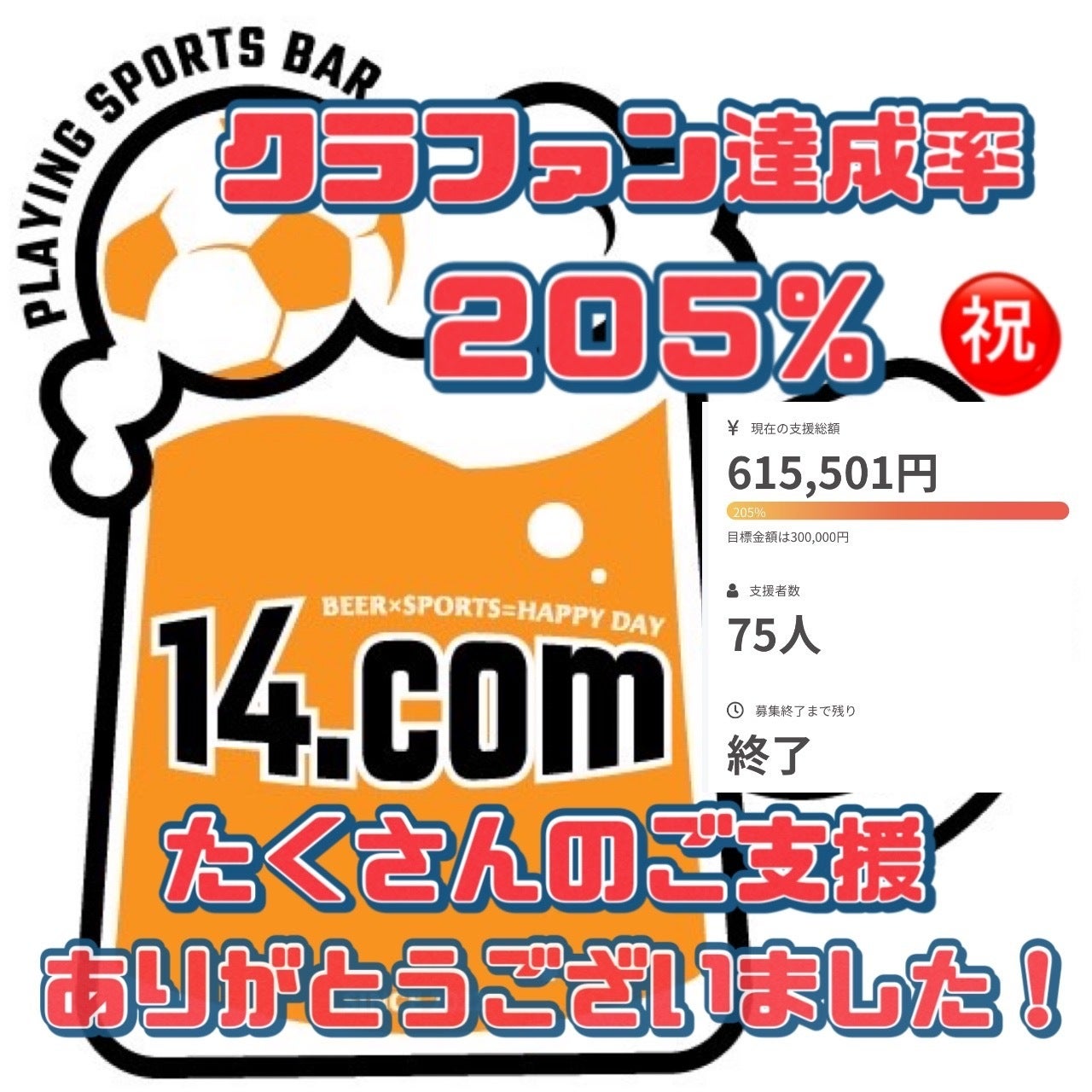 2022/08/15 20:55皆様のお陰で目標を大幅に達成、ネクストゴールまでも達成することができました!ありがとうございます!改めて自分はいろんな人に支えてもらっていることを再認識しました。以前の投稿でも言いましたが、「また遊びに来たい!」「最近犬山盛り上がってきたね!」と思ってもらうことが皆様への恩返しだと思っています。まずはオープンまでにいろんな事が起きると思いますが、常に自分らしく乗り越えて行こうと思っています!インスタでもリアルタイムで投稿していきますので、是非フォローとお店のPRをお願いします!https://instagram.com/14.com_playingsportsbar?r=nametag順番にリターン品の準備をしていきますので楽しみにしていてくださいね!取り急ぎお礼まで。 もっと見る