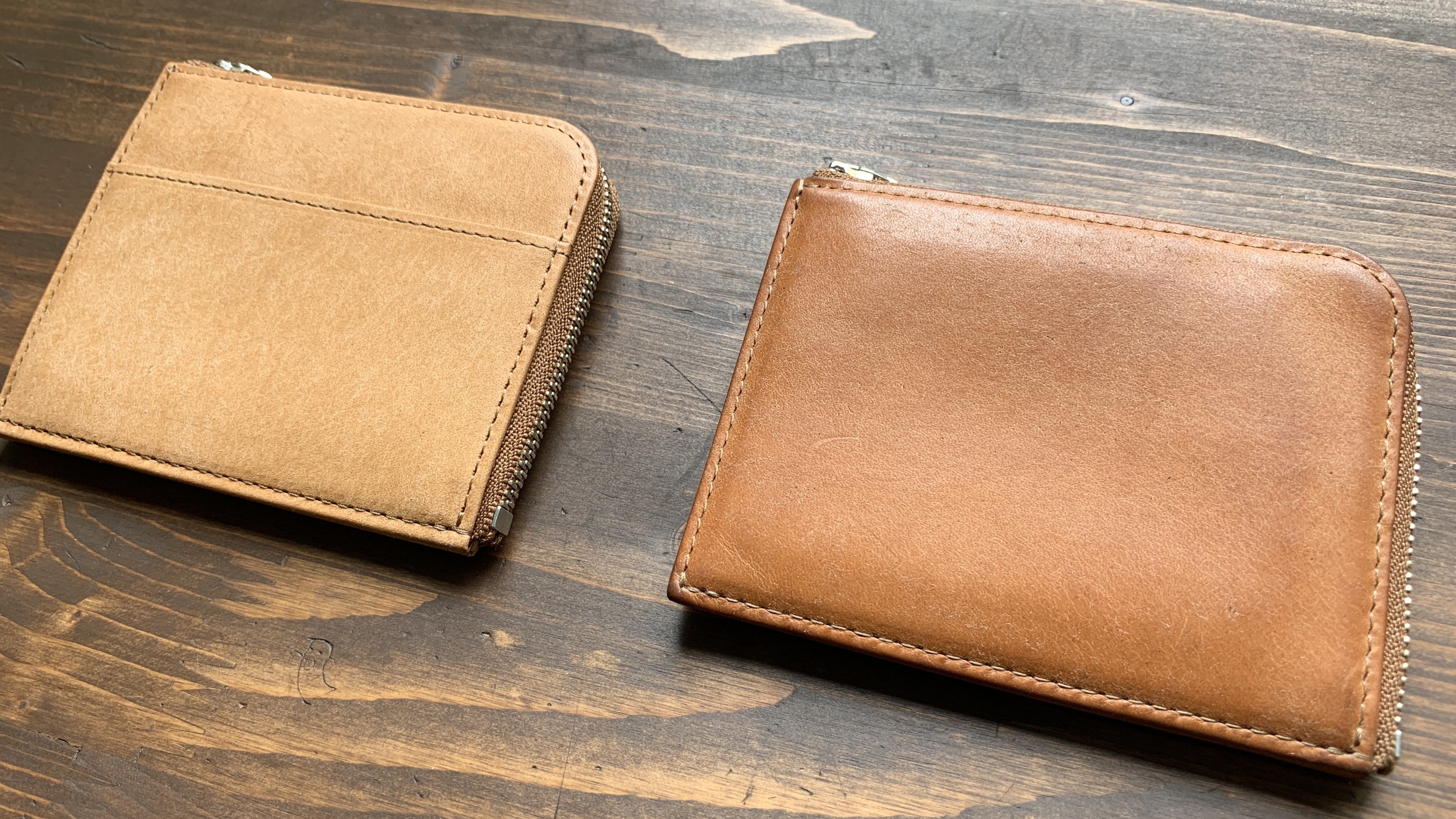 右側がサビアを半年程使用したエイジングサンプルです。色が濃くなり、かなり艶が出ています。ザラッとした手触りはなくなり、ツルツルとした気持ちのいい手触りに変化しています。