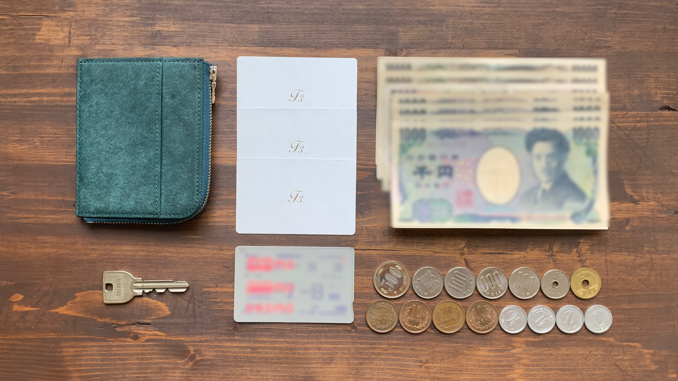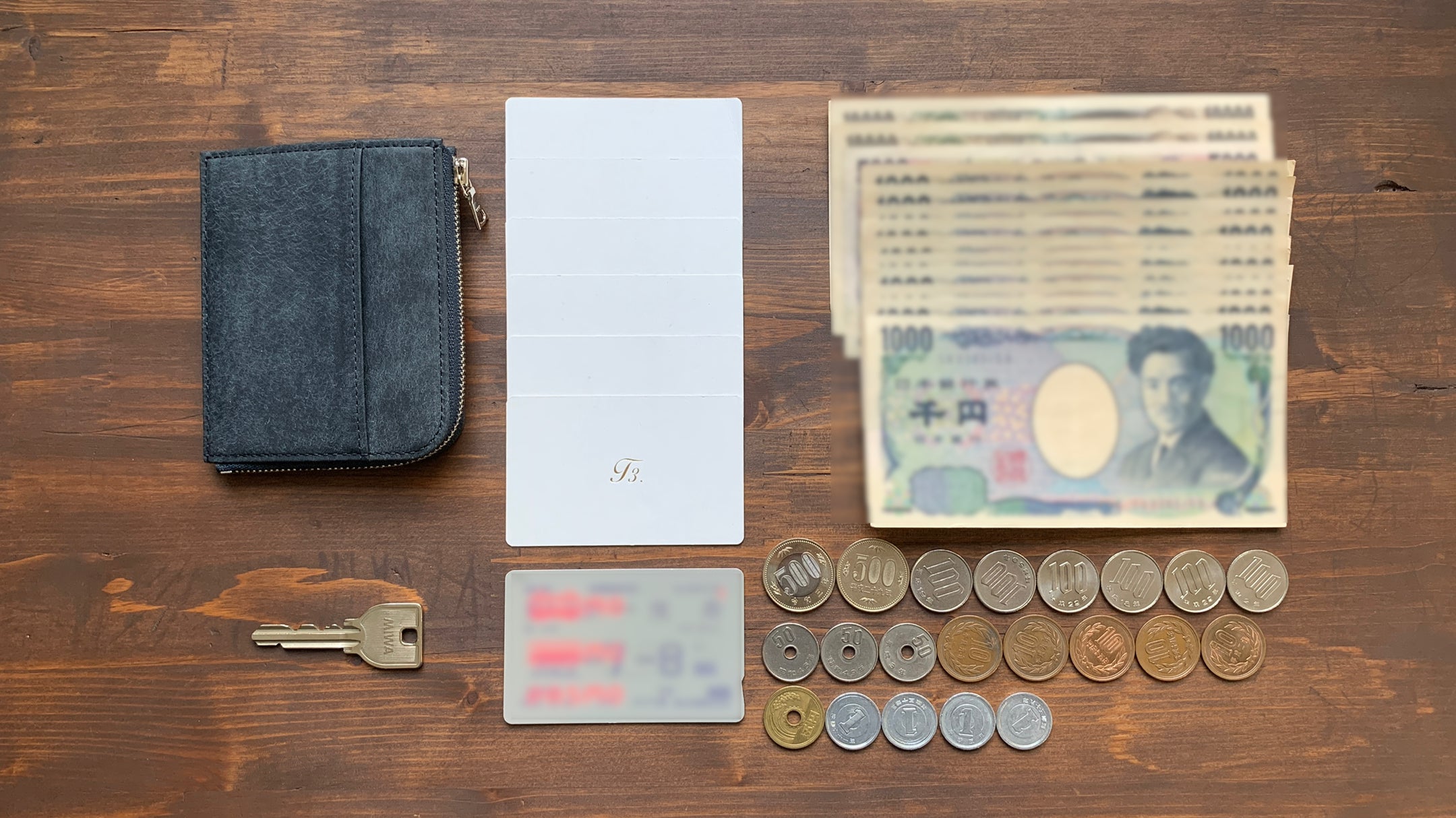 紙幣7枚、小銭15枚、カード3枚、ICカード1枚、鍵1本