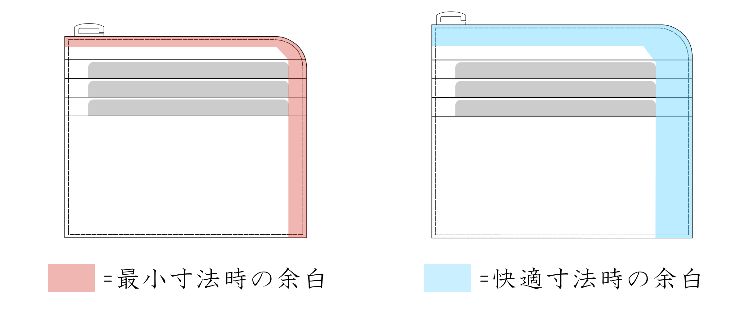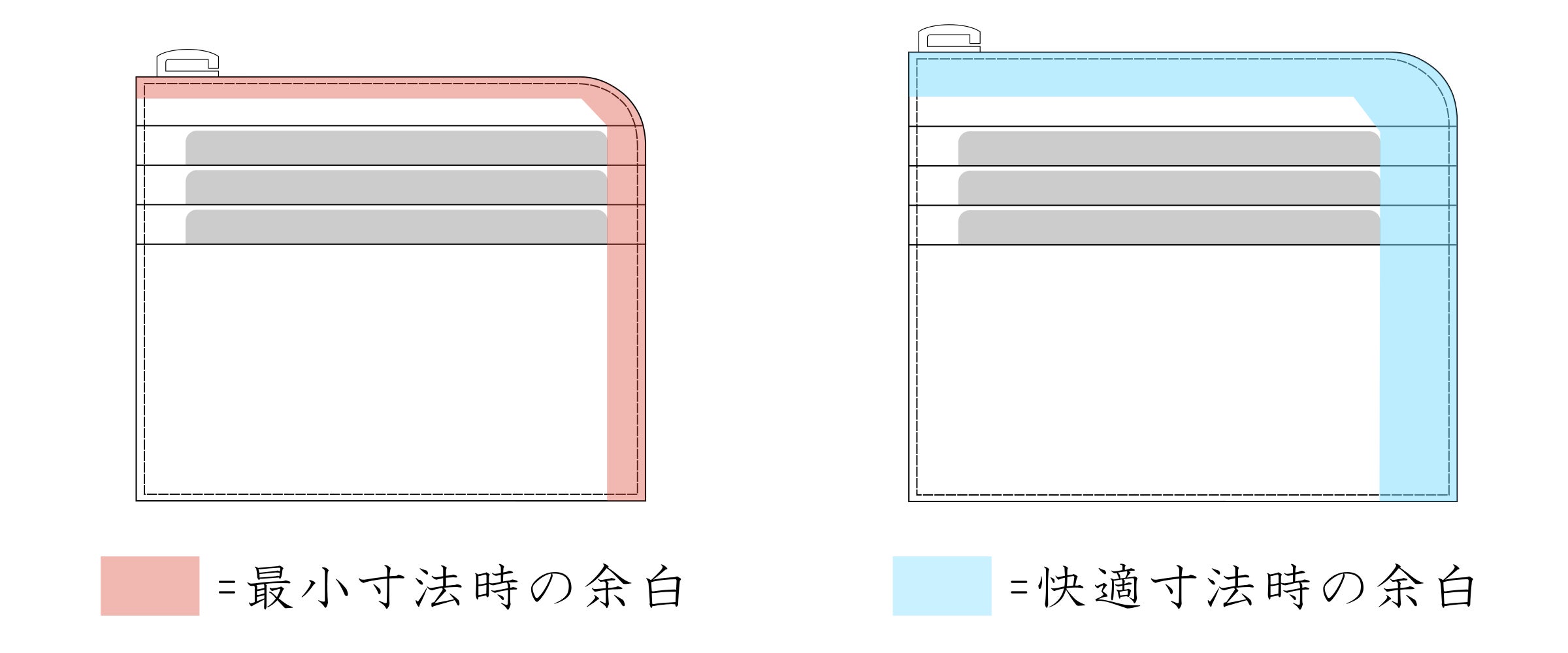 最小寸法より少し大きくすることで余白が広くなり、紙幣がファスナーに引っかかったり、カードがキツくて出しづらいというトラブルが軽減されます。