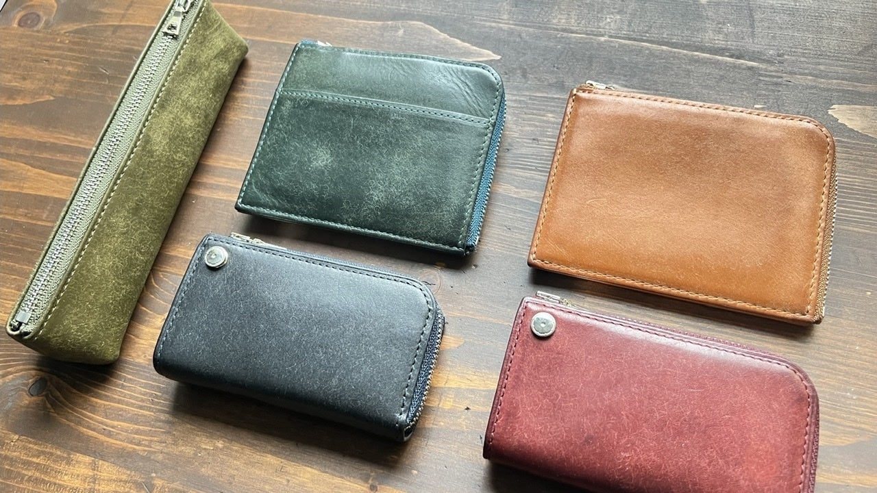ご支援者様及びご検討中の皆様こんにちは! Fitプロジェクトチームです。 他商品も混ざっておりますが、ブラック以外の経年変化サンプルが揃いましたので写真を掲載いたします。 因みにブラックはあまり変わらないのでは?!と思いきや、艶と深みが増して色気のある大人なブラックに変化します。 ご支援をご検討中の方も、引き続きご検討よろしくお願いします。