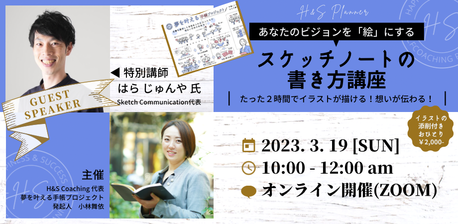 夢を叶える手帳プロジェクト、運営事務局です。3/19(日)に予定しておりました「スケッチノート講座」に関しまして、延期になりましたことをご報告いたします。お申込みいただいた皆様、大変申し訳ございません。日程が決まりましたら、改めてご案内いたします。何卒、ご理解のほどよろしくお願いいたします。夢を叶える手帳プロジェクト運営・責任者小林舞依happiness.and.success@outlook.jp080-2394-2994============こんにちは!夢を叶える手帳プロジェクト 発起人の小林舞依です。言いたいことが、伝わらない!「自分のやりたいことが、上司にわかってもらえなかった…」「子どもに伝えたいんだけど、なかなかわかってくれない…」「夢やビジョンはあるけどうまく言葉にできないんだよな…」そんな経験ありませんか?こんなとき、会話の間に伝えたいことが描かれている“絵”があれば、2人のイメージが近付いて、お互いが納得できる答えに辿り着けます!そんな『スケッチコミュニケーション』を、たくさんの方ができますように!その為のワークショップを企画しました! 今回は、『スケッチコミュニケーション』を伝えている原純哉(はら じゅんや)さんを特別講師としてお招きし、「スケッチで自分のビジョンや想いを描いてみよう」を実践するワークショップを開催します!◆主催の小林舞依より手帳プロジェクトがどんどん形になっていく中で「多くの方に手帳プロジェクトの魅力を伝えたい」という思いがふつふつと沸いてきました。ですが、やりたいことが多すぎて ・話が長くなってしまう… ・うまく話がまとまらない… ・相手にどこまで伝わっているのか不安…など、言葉にすることが億劫になっている自分がいました。。。そんなとき知人のSNSで原さんのことを知り、すぐさま「ぜひお願いします!」と連絡。 ↓ ↓ ↓手帳プロジェクトに込めた想いや、発足のきっかけを聴いていただいてできたイラストがこちらです。こんなふうに想いやビジョンを自分でも絵にできたなら、もっと夢が大きくなるに違いない!そう確信して、原さんに今回の特別講師を依頼しました。自分の手帳に、自分の手でビジョンを絵にできたら、あなたがやりたいことがもっともっと具体化してワクワクが止まらなくなります!私、小林も一緒に受講生として参加します。特別講師なのに特別価格で受講できる、このチャンスを逃さずにご参加くださいね! ◆スケッチノートの書き方講座日 時 2023.3.19(日)10:00-12:00am場 所 オンライン(ZOOM) URLは決済完了後にメールでご案内します。参加費 ひとり¥2,200(税込) チケットは必ずPeatixにてお求めください。https://hsplanner0319.peatix.com/定 員 10名※手帳を持っていない方もご参加いただけるイベントです。得られること・簡単な絵の描き方が分かる・話の情報を、簡単な絵と短文で 表現する「情報可視化方法」が分かる・ワークを通じて、情報可視化手法を 身に着けることができるこんな人におすすめ・夢やビジョンを絵にしたい方・手帳をもっとワクワクするイラストで彩りたい方・過去の情報を瞬間的に思い出せるメモを残したい方・人に伝えるときに絵を活用したい方ワークショップ内容・Sketch Communicationのご紹介・スケッチノートの解説・簡単な絵の描き方ワーク・情報抽出ワーク・スケッチノート実践ワーク※内容の詳細は変更の可能性があります。【講師】原 純哉(はら じゅんや)Sketch Communication 主宰重工業メーカに勤務しエンジニアとして働く傍、グラフィックレコーディング、アイデア図化などの"スケッチ活動"を行なっている。https://www.sketch-cmn.com/【主催者】夢を叶える手帳プロジェクト発起人 小林舞依happiness.and.success@outlook.jp
