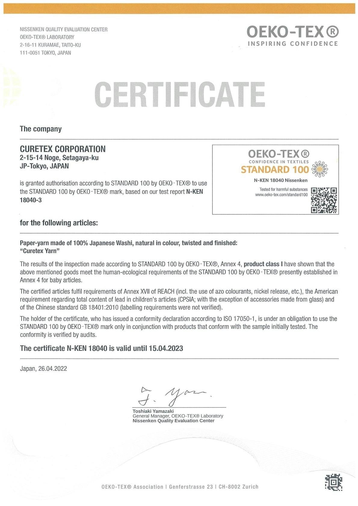 green greenで採用する和紙は繊維製品の国際的安全基準「エコテックス® スタンダード100※」認証を取得しており、取得した「製品クラス I」は36か月までの乳幼児、幼児期に触れる繊維製品を 対象にした最も厳しい認証クラスをクリアしています。