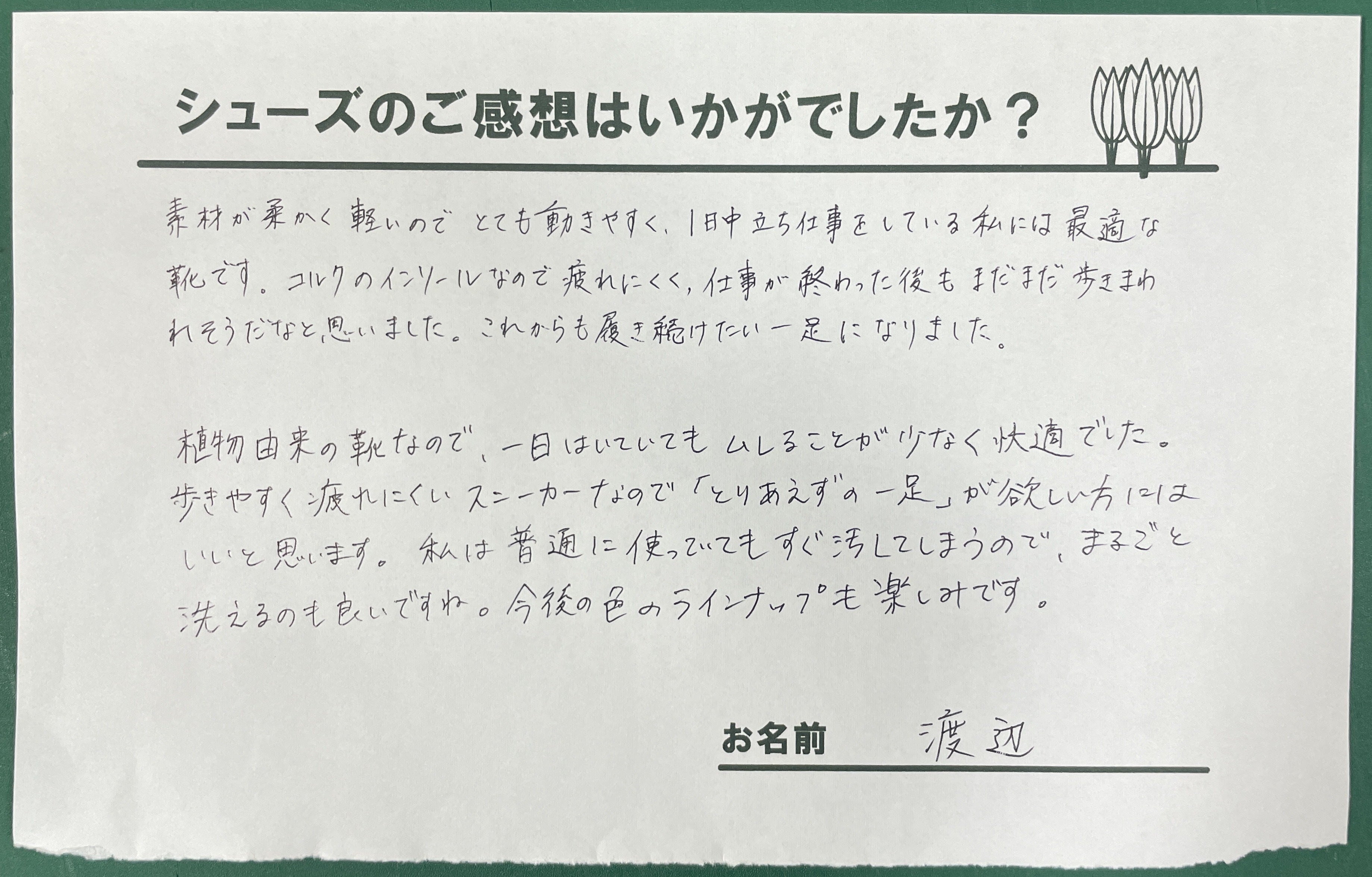 「植物由来の靴なので、1日履いていてもムレることが少なく快適でした。