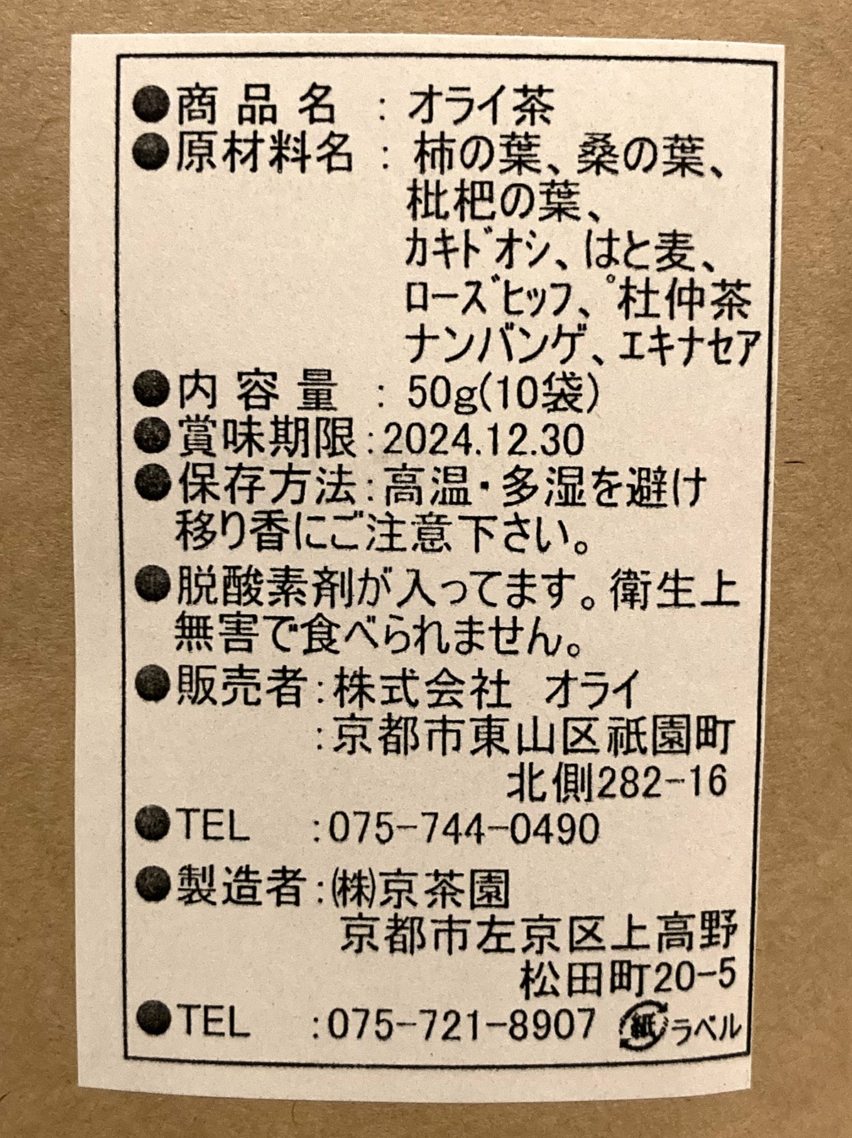 オライ茶は1袋に10包のティーバッグ入りです。1包で約2リットルのお茶が作れます。