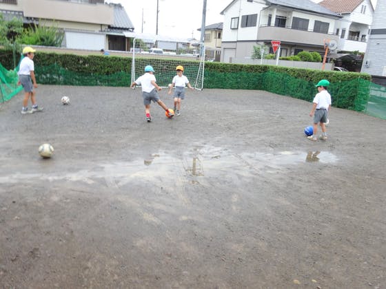 明け方までの雨で大きな水たまりが出来てましたが、昨日は強雨で「朝体育」が出来なった子供達は、ボールを蹴り始めました。