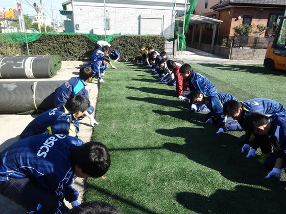 念願の人工芝を1月28日(土)に藤枝明誠高校サッカー部員達のサポートにより敷工しました!