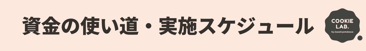 今回のクラウドファンディングでご支援いただいた総額から、CAMPFIRE手数料17%を引いた残りをすべて、Cookie LAB.運営費及び、雇用拡大のための諸費用とさせていただきたく思います。