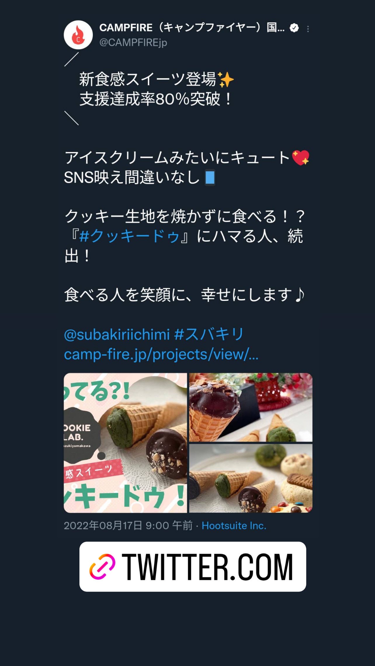 プロジェクトをご覧の皆様、いつもご支援いただきありがとうございます。本日は皆様へお知らせがございます。当店Cookie LAB.は大阪は本町にて店舗を開設致しました!皆様からのご支援や応援が私たちの背中を押してくださいました!本当にありがとうございます。クラウドファンディング挑戦期間も残りわずかとなりましたが、引き続き応援よろしくお願い致します。店舗情報Cookie LAB.本店541-0056大阪市中央区久太郎町3-1-27 ヒグチビル1階HUB kitchen内https://hub-kitchen.jp/shop/ぜひお近くの方は当店自慢の焼き立てクッキーとその場でお作りする新感覚クッキー「クッキードゥ」をぜひご賞味くださいませ☆