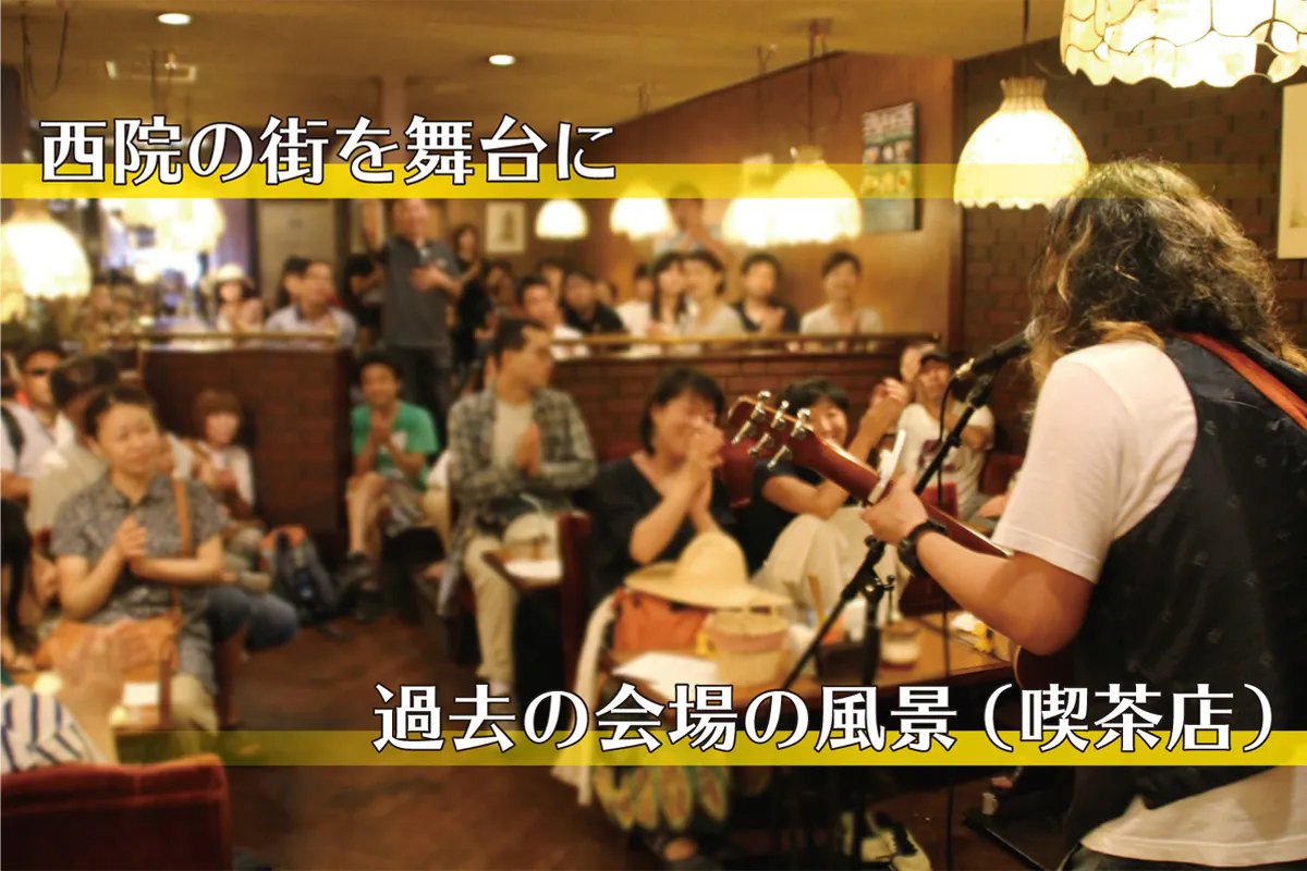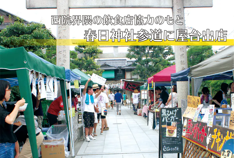 西院春日神社をメイン会場に、路面電車や銭湯に幼稚園、飲食店やライブハウス等、「西院のおもろい場所」にて音楽ライブや芸術パフォーマンス等を行い、さまざまな方がふらっと遊びに来られるよう、入場無料(※アーティストへの投げ銭制)で行ってきたお祭りです。2019年まで毎年8月に開催してきました。