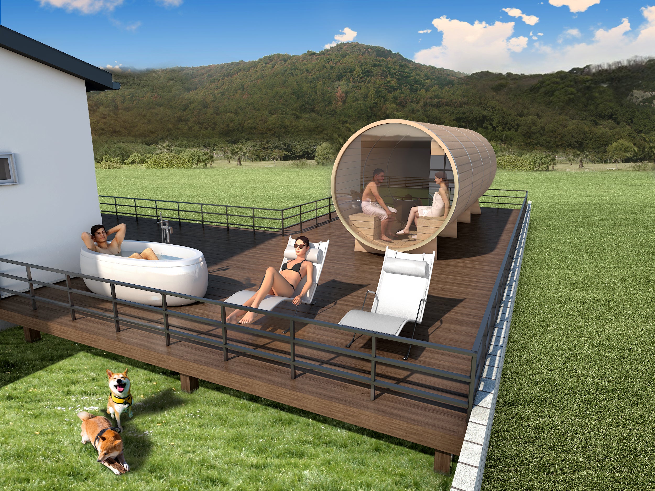 また、ドッグランの一番奥にウッドデッキゾーンを作り、バレルサウナを設置します。眼前には広い瀬戸内海が。バレルサウナもスケルトンのため、サウナ、水風呂、外気浴どれも海を眺めながらリラックスしていただけます。