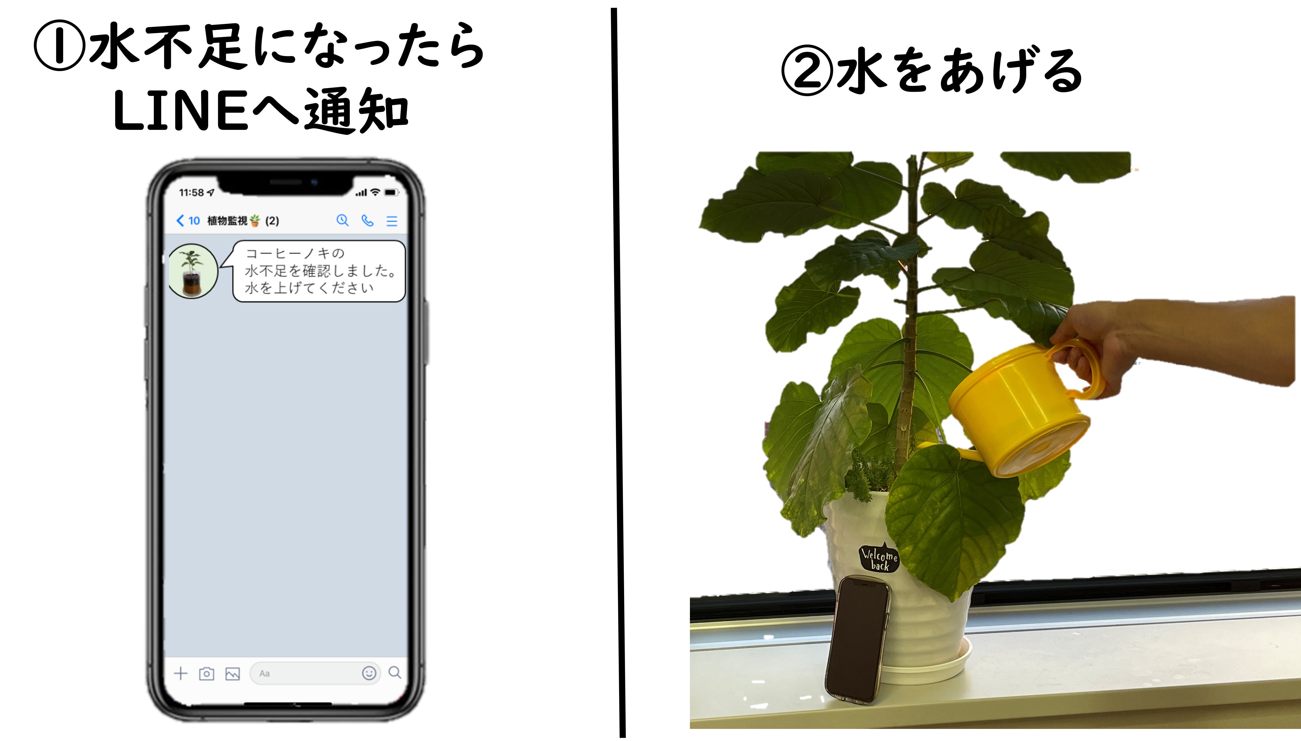 ①水不足や良くない環境(強い直射日光、適さない温度)のときにLINEへ通知。