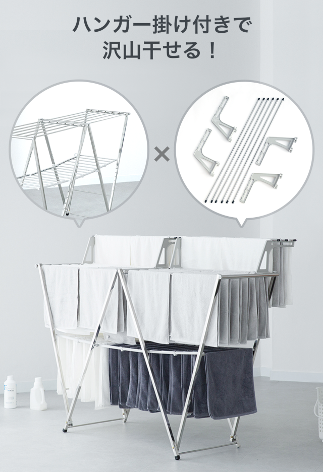 W字設計で大量に洗濯物を干しても安定感抜群。Yシャツ、ズボン、お布団まで全て干せちゃいます。屋内外両用・コンパクトに収納できる折りたたみ式。ファミリー向けと一人暮らし向け、2種類のサイズをご用意!