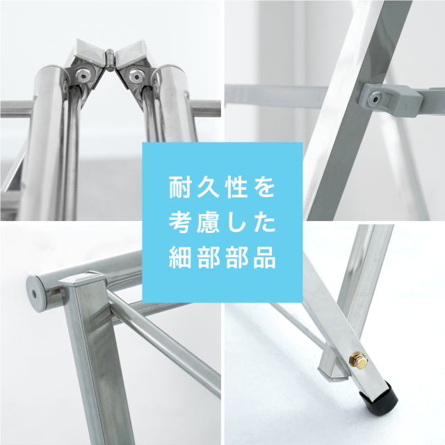正方形支柱8本のW字設計で耐久性・安定性を保つ、耐久性を考慮した細部部品