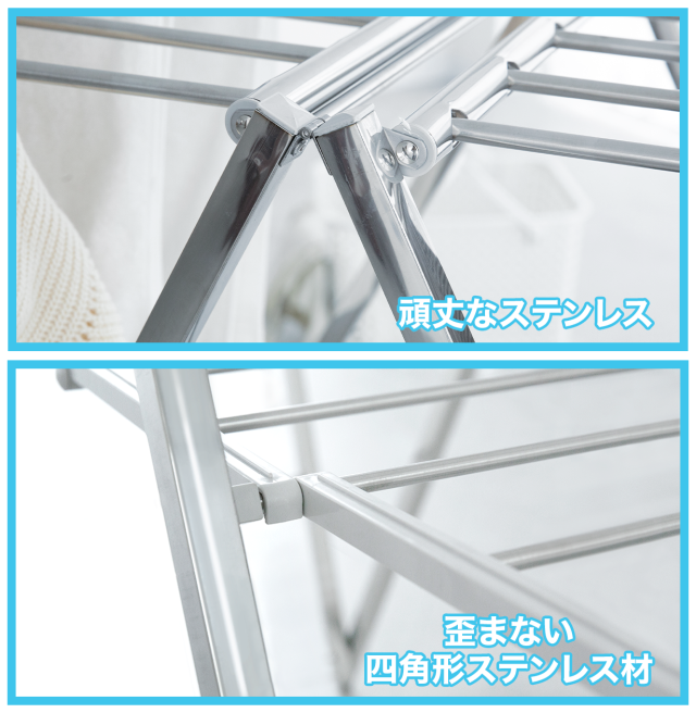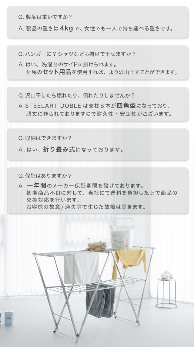 STEELART DOBLEに使用される骨組みはステンレス製で正方形に製作されていて、突っ張り棒が曲がったり壊れたりして倒れることがないです。更に重さも4Kgと軽くて頑丈な洗濯掛けです!