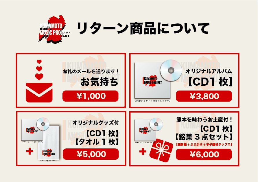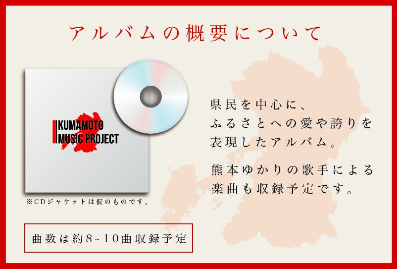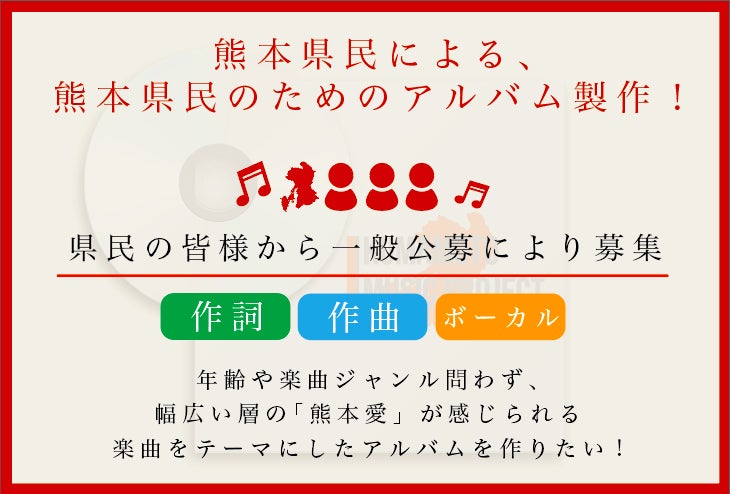 アルバムに収録する楽曲のうち4曲〜5曲を熊本県民のみなさまから「作曲」「作詞」「ヴォーカル」