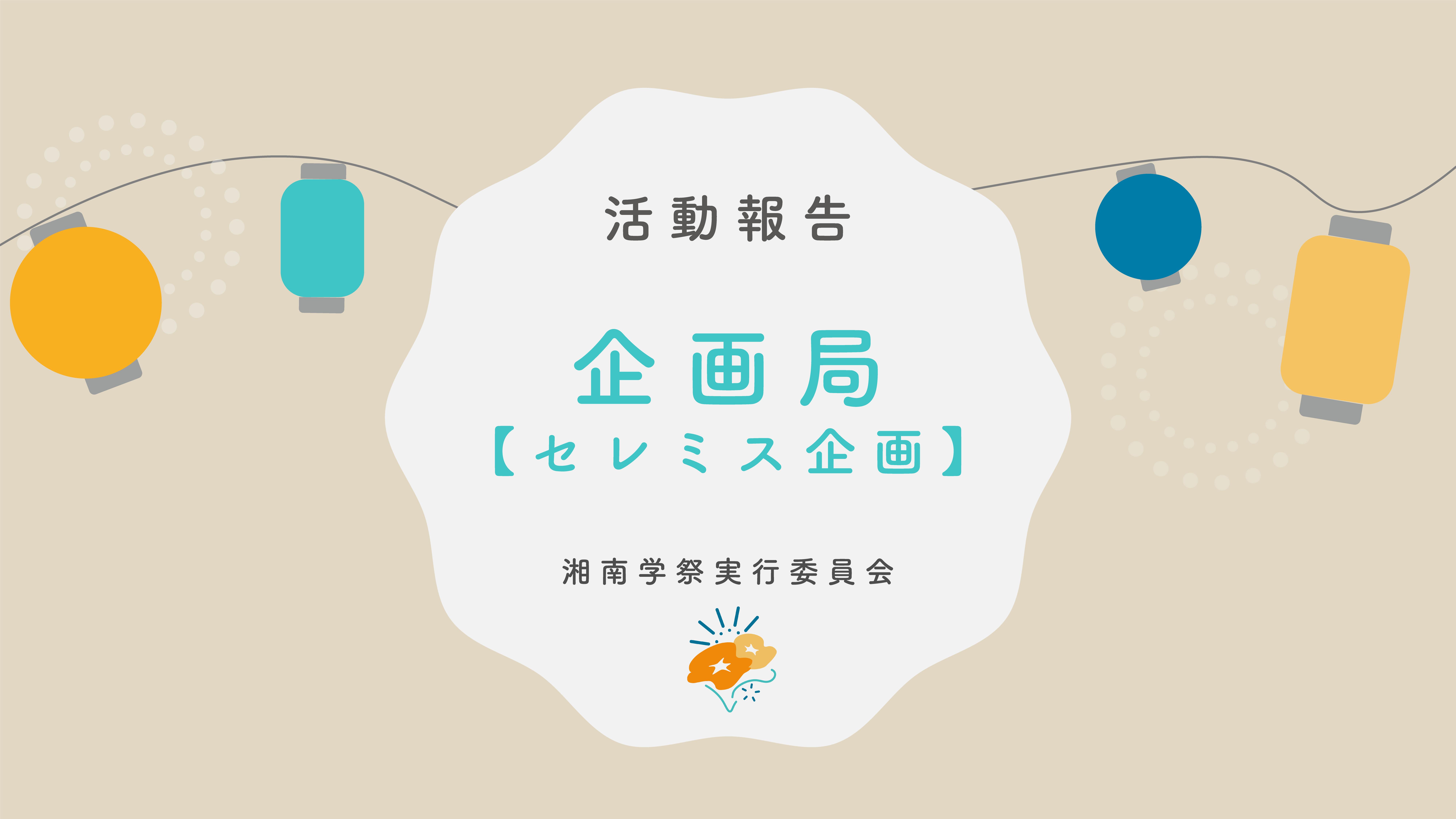 2022/07/01 19:36こんにちは!湘南学祭実行委員会の活動の様子をお届けします!第12弾はセレミス企画です!__________________________活動報告をご覧いただきありがとうございます! セレミス企画に所属している1年の平井瑛大と申します。 今回の活動報告ではセレミス企画についてご紹介いたします!早速ですが、「セレミス」って何でしょうか?「セレミス」とは...「セレモニー」と「ミステリー」の頭文字をとって作られた言葉で、私たちセレミス企画では"開閉会式"と "キャンパスを舞台にした謎解き企画"の準備を行っています!実は、七夕祭で開閉会式を揃って行うのは本年度が初めてで、第1ステージを舞台にYouTubeで同時配信も行なわれます。開閉会式のテーマはそれぞれ「お祭り」と「満開」。様々な団体をお招きし、七夕祭の始まりと終わりを盛り上げます!謎解き企画とは、キャンパス中に散りばめられた謎(問題)を解きながら物語を進めていく企画です。私たち1年生は主にこちらの謎解き企画の準備に携わっていて、ストーリーや実際に出す問題、それを形にするための装飾やデザインの作成を行っています。放課後や休日に企画のメンバーと共に、試行錯誤しながら準備を進めています!また、他の企画と一緒に作業を進める「企画大会」は、湘南学祭実行委員会の先輩や同級生と仲良くなれる、とてもやりがいのあって楽しい時間です!今年の七夕祭は3年ぶりの対面開催です。開閉会式の圧巻のパフォーマンス、頭と体を動かす謎解き企画を、是非キャンパスに足を運んでお楽しみください!_________________________続いては縁日企画です! もっと見る