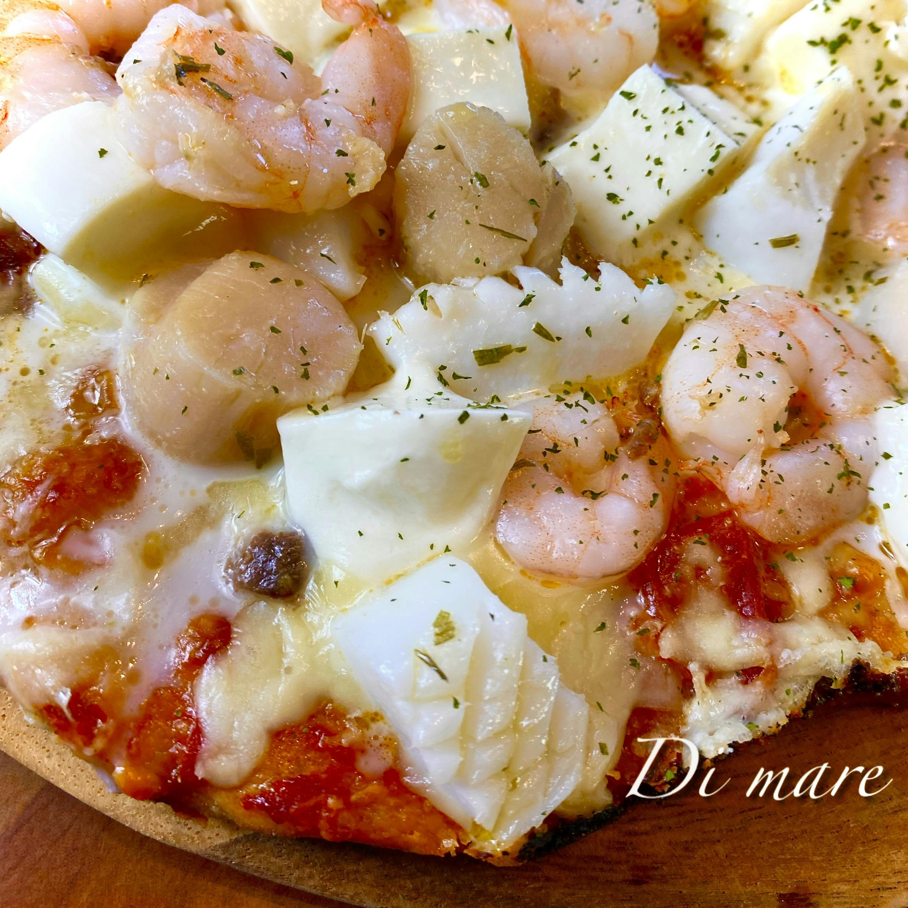 さて、写真は、ディマーレのピッツァです。自宅で作ると、一番人気のディマーレは、エビ、イカ、帆立、アンチョビの乗った魚介たっぷりのピッツァです!