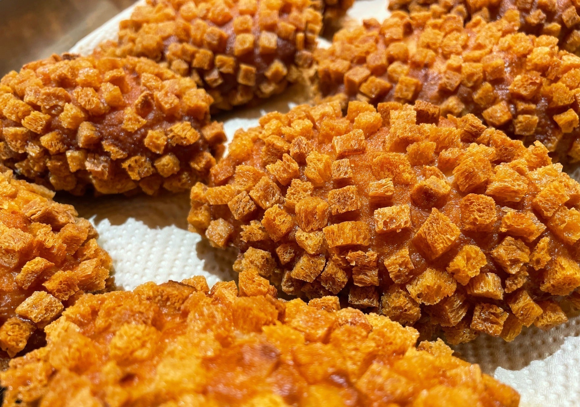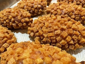 カレーパングランプリ2年連続金賞受賞。通常のカレーパンがパン粉をつけているのに対し、クルトンを使用したかつてないザクザク食感。