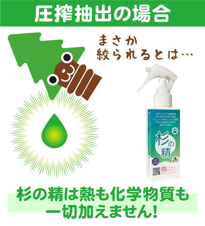 「杉の精」は、アルコール、界面活性剤、化学物質等を一切使用せず、水すら加えません。