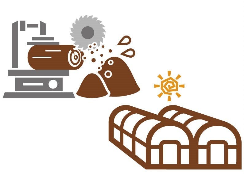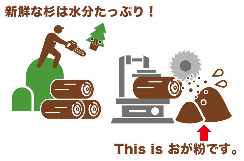 そこから杉の樹皮を剥ぎ、樹幹部の部分を粉状に粉砕したものを「生おが粉」と呼びます。