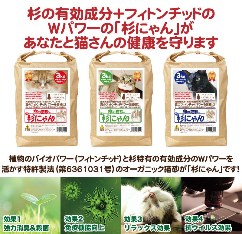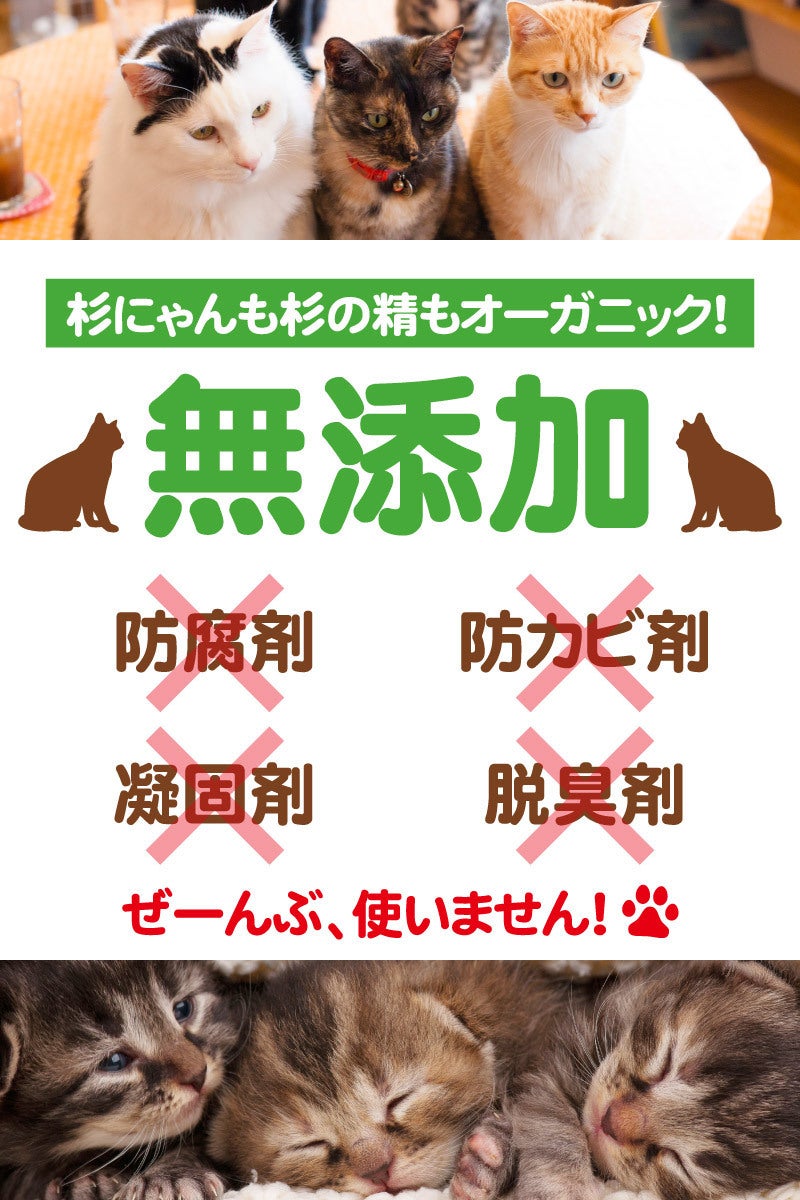 杉にゃん本舗(TEAM杉にゃん)は、「杉」の有効成分を活かすテクノロジー(特許取得:第6361031号)で、完全無添加かつ猫の健康を守るオーガニック猫砂「杉にゃん」を開発し、日々ご愛用者様が増え続けております。
