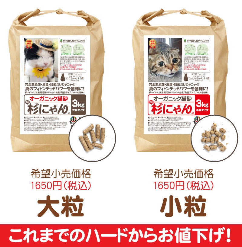 これまで、オーガニック猫砂「杉にゃん」のラインナップは粒に応じて3種類でした。