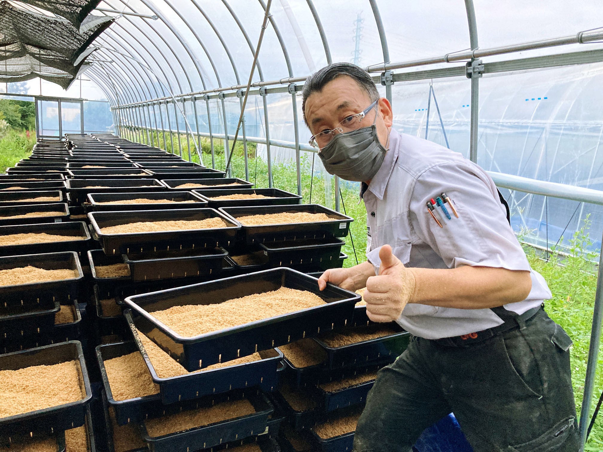 ビニールハウスと大量に並ぶ黒トレー。