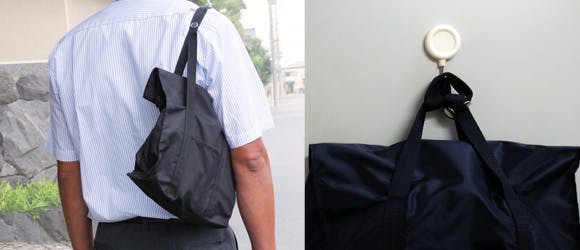 ●専用バッグは肩にかけて持ち運べるよう、長さを決めました。また机の脇・デスク下などに掛ける際、床に着かないよう、肩紐をループ状に絡めフックにかけ、スムーズに収納することもできます。