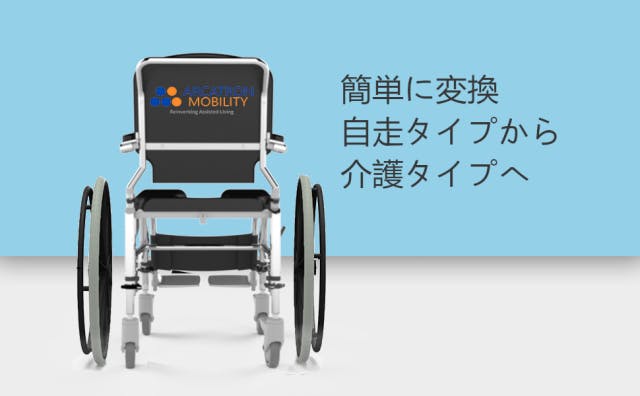 アルカトロン社製のSSS100はご高齢や運動機能が低下した方が、ご不安なくかつ便利にシャワーやトイレを利用できるように設計された自走式車椅子です。工具を使わずに高さを調節できるので、ベッドへ(から)の移乗が容易です。あるいは便器の高さに合わせて調整することもできます。自走用の大きな車輪を取り外してキャスターを取り付ければ介助型(手押しタイプ)としても使用することができます。