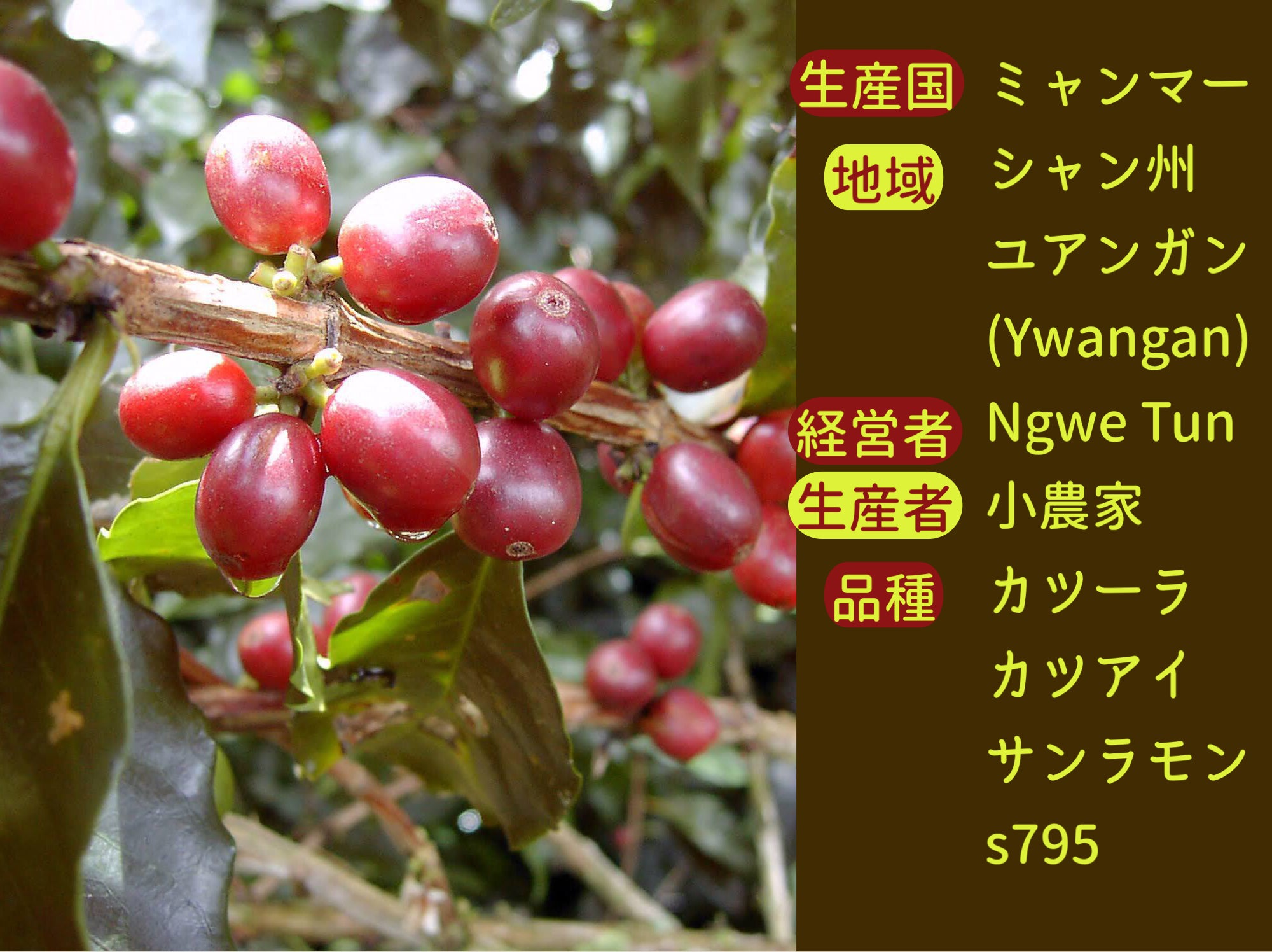 このミャンマーコーヒーはアラビカ種の中の【カツーラ/カツアイ/サンラモン/s795】という品種改良された品種です。世に出回るコーヒーの約90%はアラビカ種で、ミャンマーコーヒーはその中でも上記の品種がメジャーです。