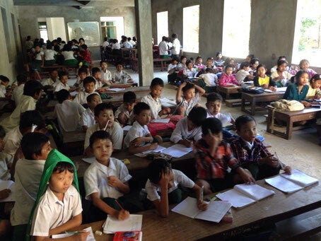 当会では、ラカイン州タンドゥエにある寺院学校での教育支援活動を行っています。保健室建設のための寄付金集めに加え、古着や靴、鉛筆1,000本を寄付しました。