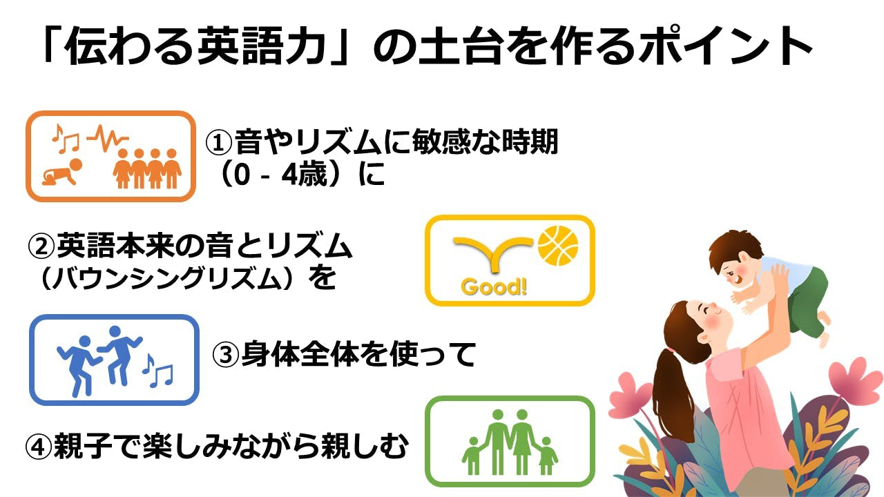 ①0歳(親子)から年中の期間に、英語圏の子どもたちが実際に使う音楽や絵本を使い、「あと伸びする英語のリズムと発音力の土台」を育みます。