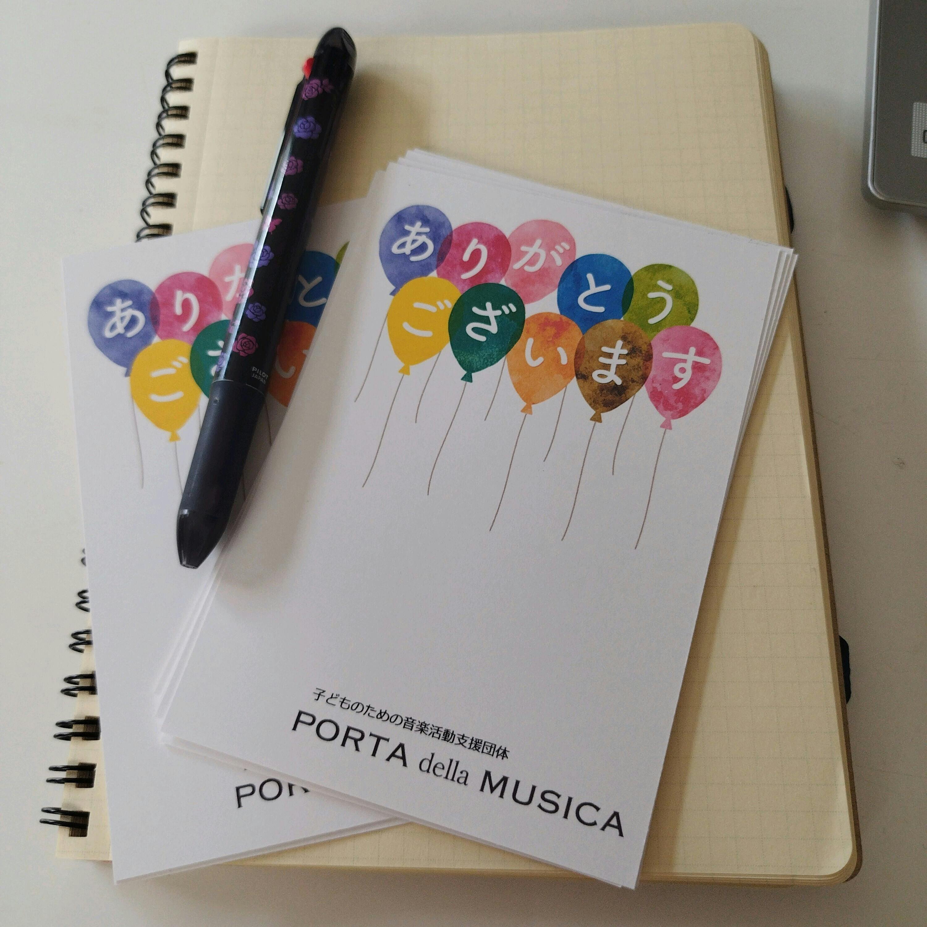 御礼のお品物と一緒に、手書きのメッセージカードと夏の講座のご案内、私たちポルタの活動が分かるフリーペーパー「ポルタのかわら版」を同封させていただきます。