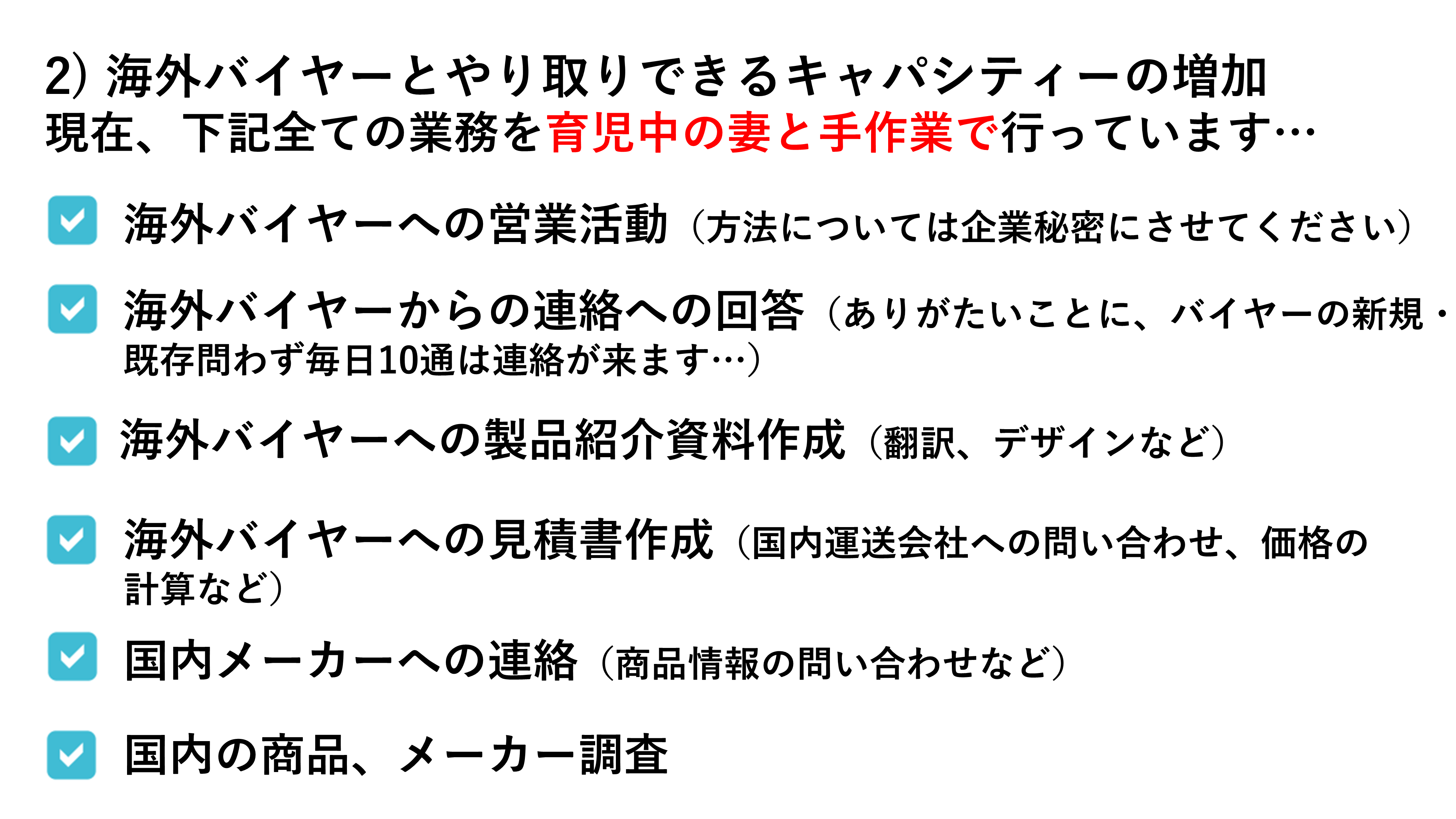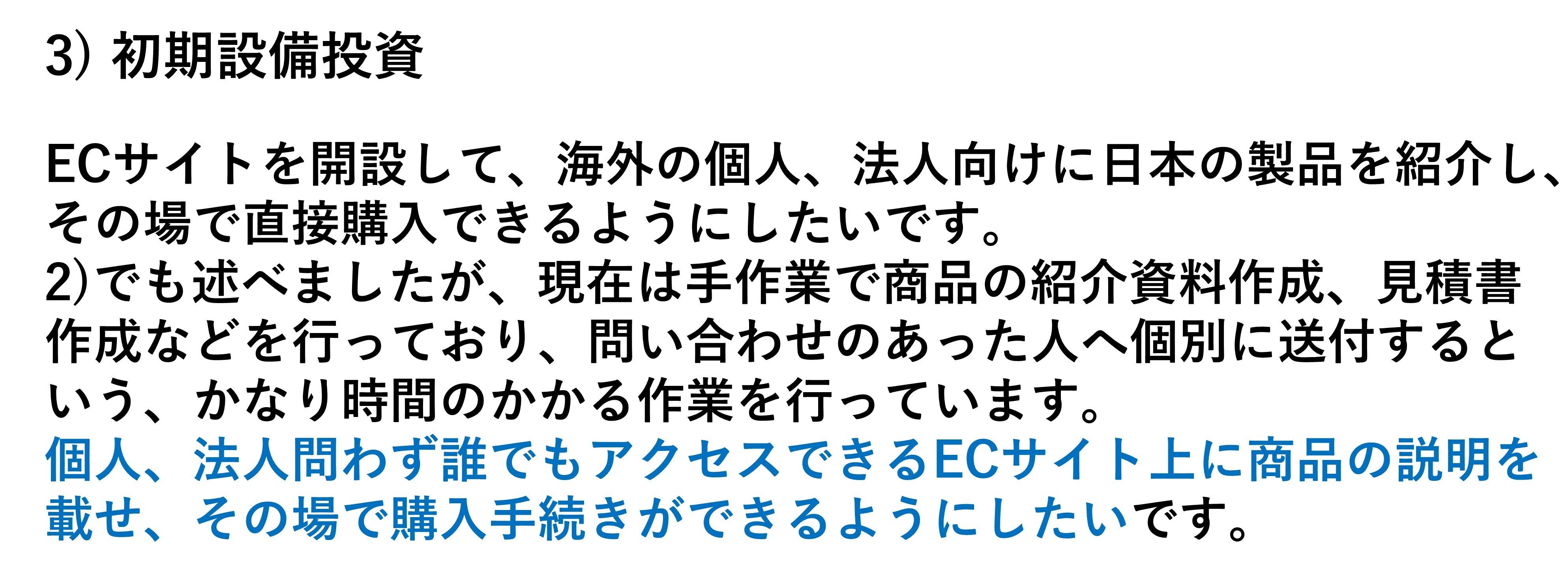 すでに多くの仕入れ先(日本企業)とはコネクションがある状況で、資金が必要な理由は下記です。