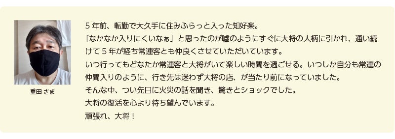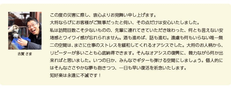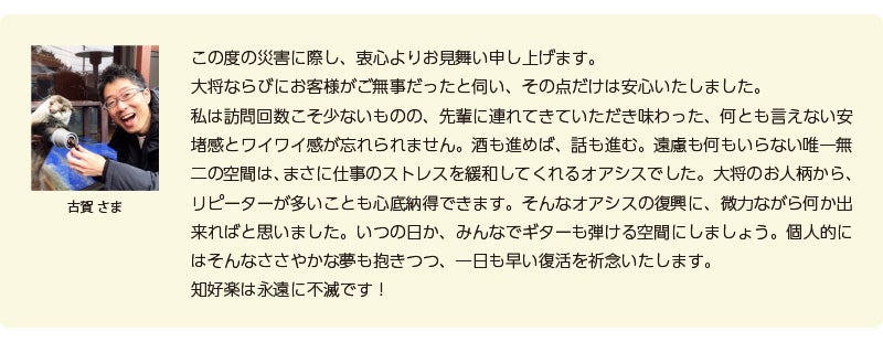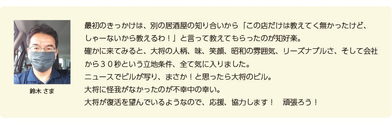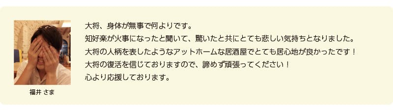 お店を再建して、この方達にも美味しいお料理とお酒を召し上がっていただき、たくさんの恩返しをしたい。 しなくてはいけないのです。