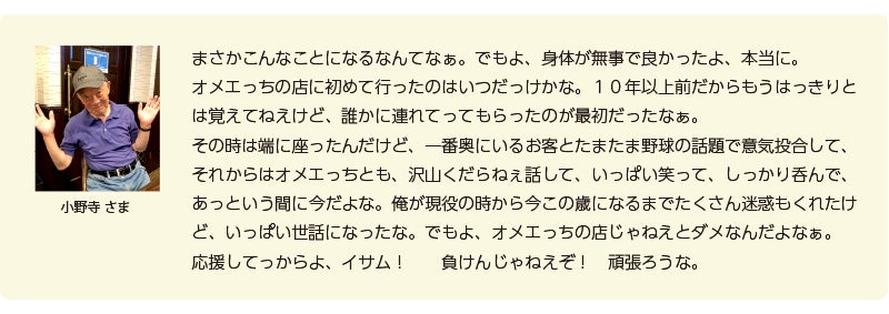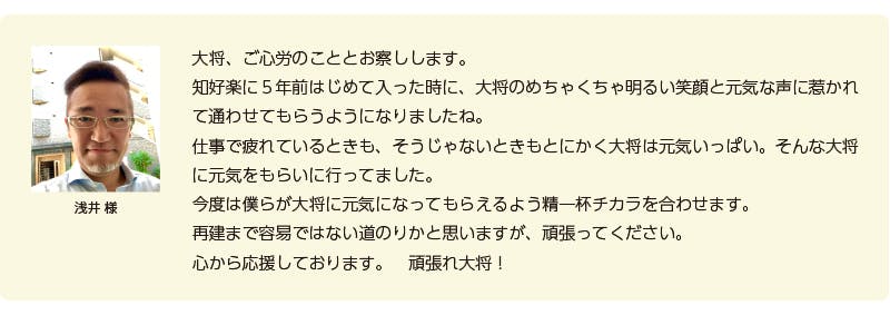そんなお客様達から「大丈夫か!」「怪我無いか?」「身体は大丈夫なんだな?」。 本当に有り難かったです。