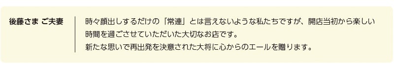 そしてもう一度、またお客様の憩いの場となり、笑い声の耐えないお店を実現(再現)させたいです。