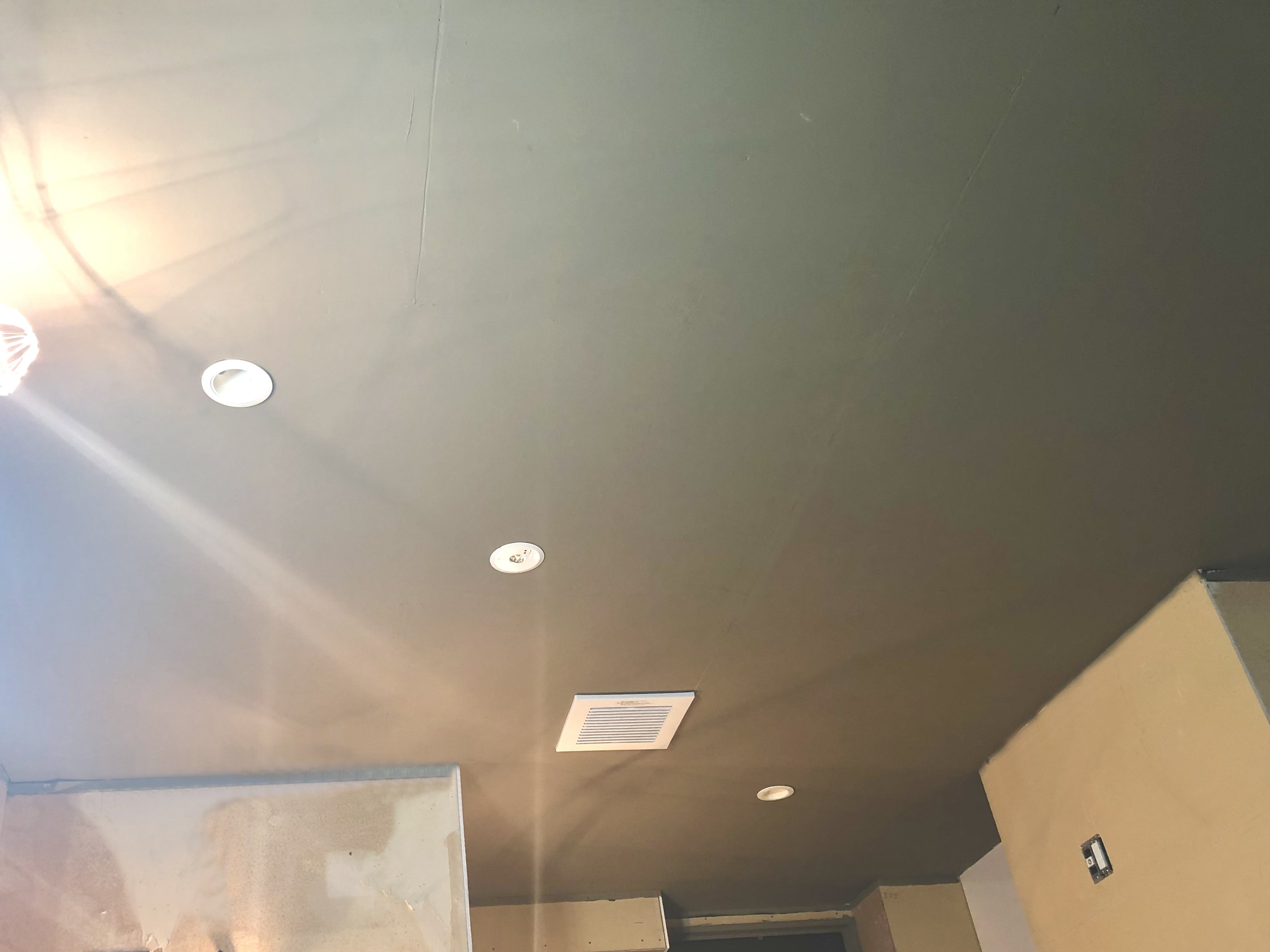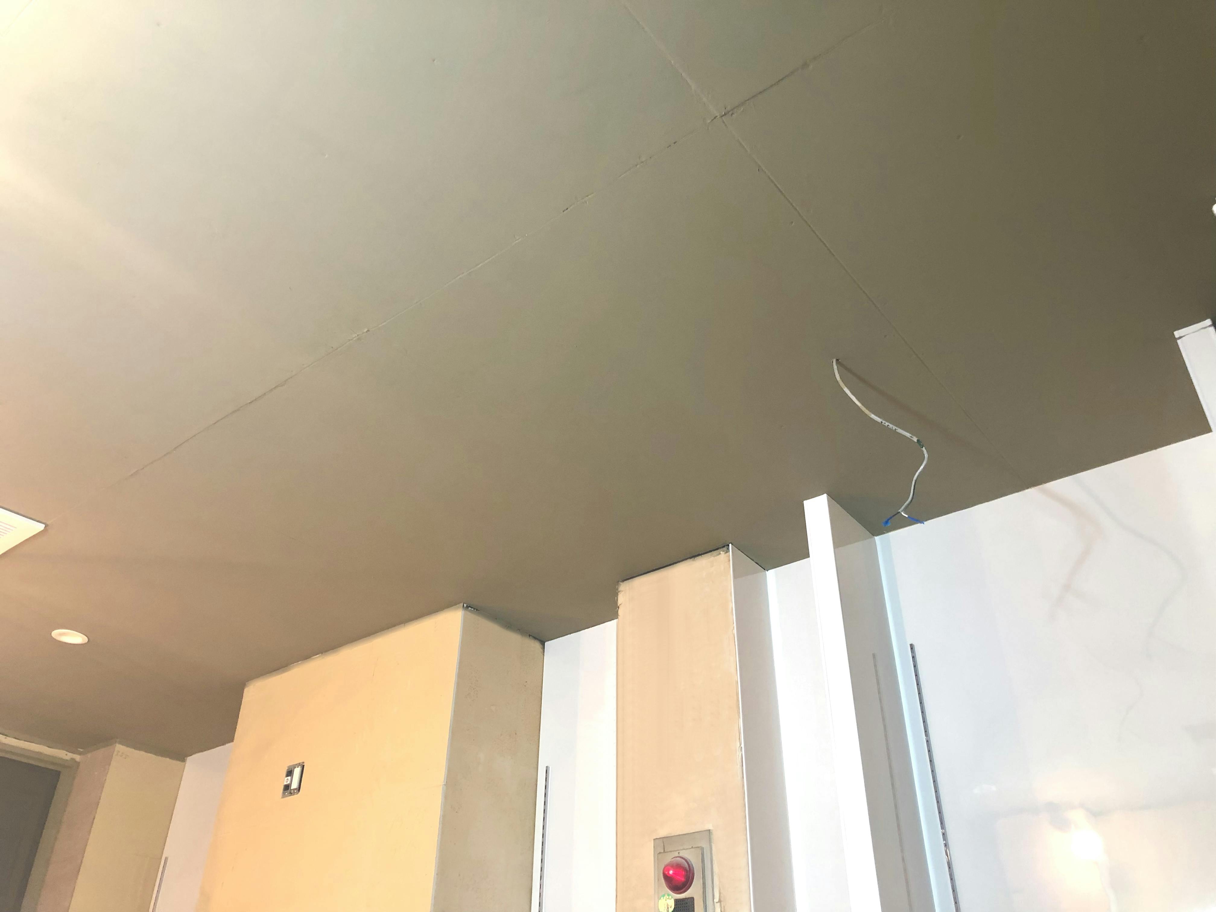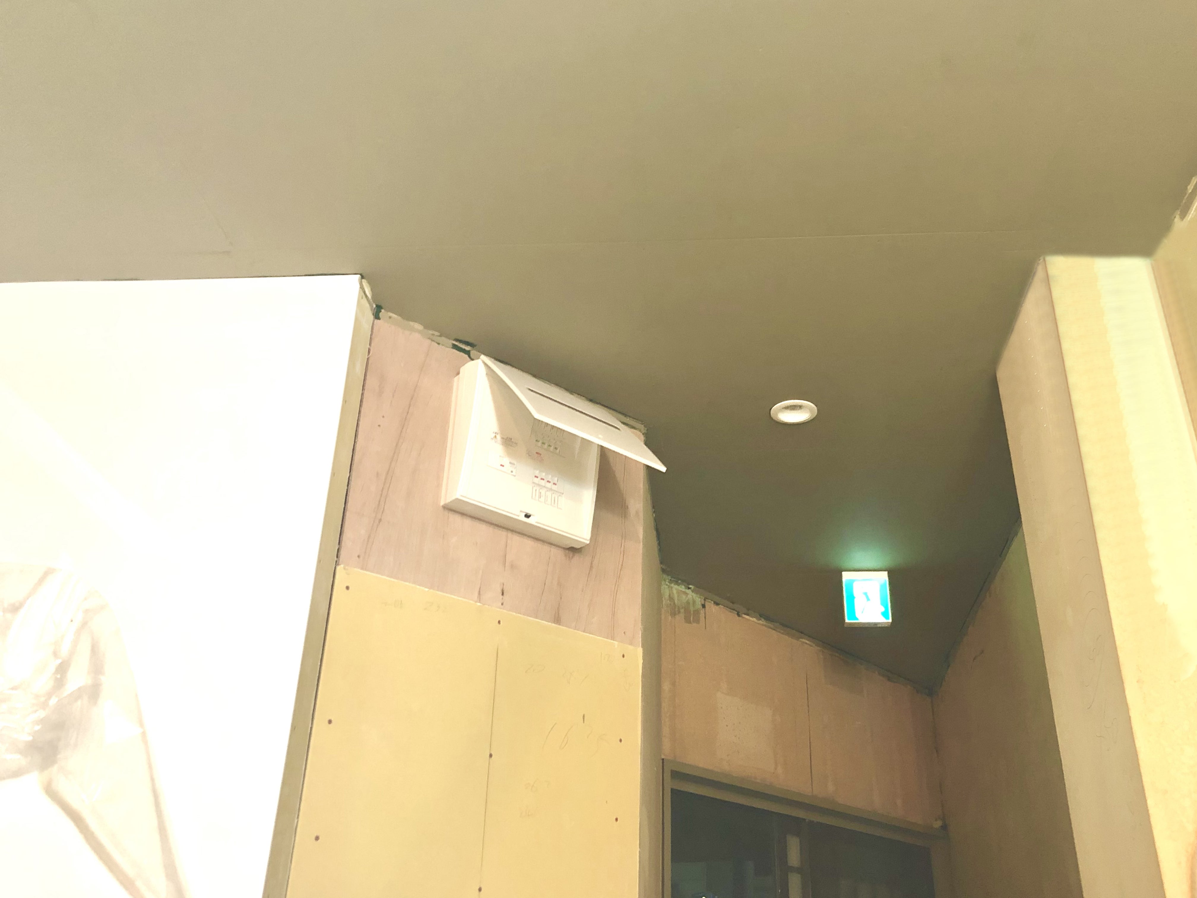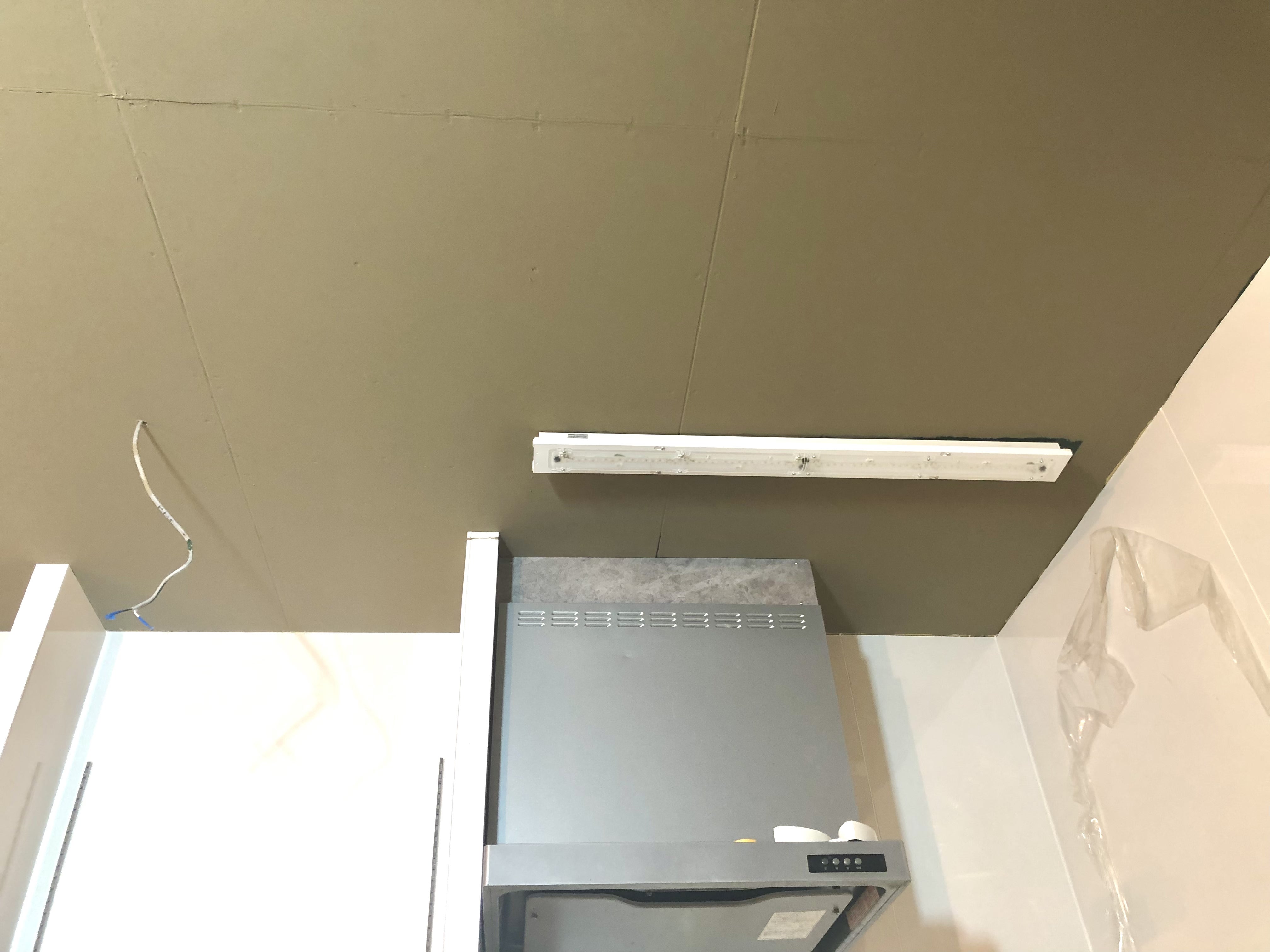 電気工事の業者さまに照明や排気口も設置していただきましたので、グンッと天井っぽくなりました。というか天井ですが。。